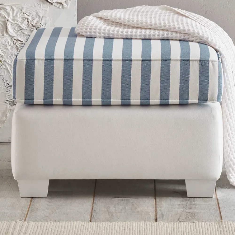 Der quadratische Polsterhocker „Ganbriassa“ ist nicht nur ein Möbelstück, sondern ein Statement für den maritimen Landhausstil. Mit seinem dekorativen Design in Cremeweiß und Blau fügt er sich harmonisch in jeden Raum ein und setzt dabei einen charmanten Akzent.