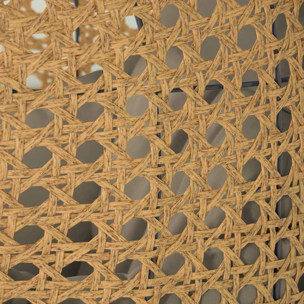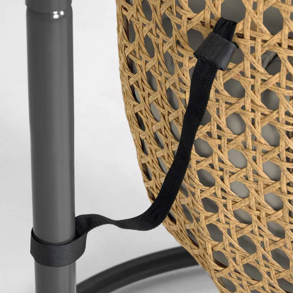 Die dekorative Beflechtung im Stil des Wiener Geflechts verleiht dem Hängesessel „Floyda“ eine besondere Note. Dieses handwerkliche Detail stammt ursprünglich aus der traditionellen Wiener Korbmacherkunst und zeichnet sich durch seine filigrane, luftige Optik und Robustheit aus. Es fügt sich harmonisch in das moderne Design ein und bietet gleichzeitig eine außergewöhnliche Haltbarkeit.