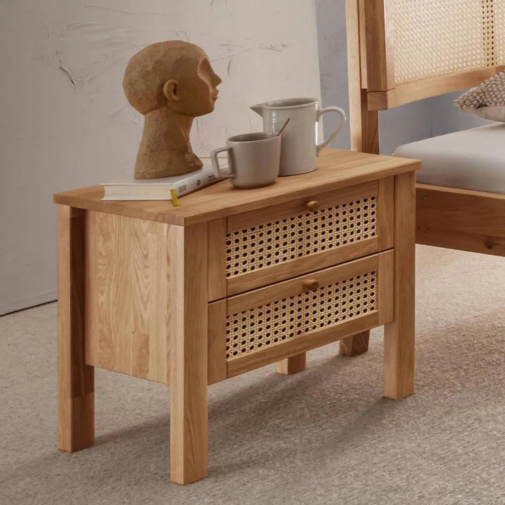 Entdecken Sie die Wildeiche Nachtkommode „Ambrosso“ – ein echtes Schmuckstück für Ihr Schlafzimmer. In den warmen, natürlichen Tönen von Wildeiche und Beige gehalten, fügt sich das Möbelstück perfekt in jeden Raum ein und sorgt für eine angenehme Atmosphäre. Die Kombination aus Massivholz und Peddigrohr im ansprechenden Wiener Geflecht Stil verleiht der Kommode einen besonderen Charme, der sich ideal in ein modernes Skandi-Design integriert.