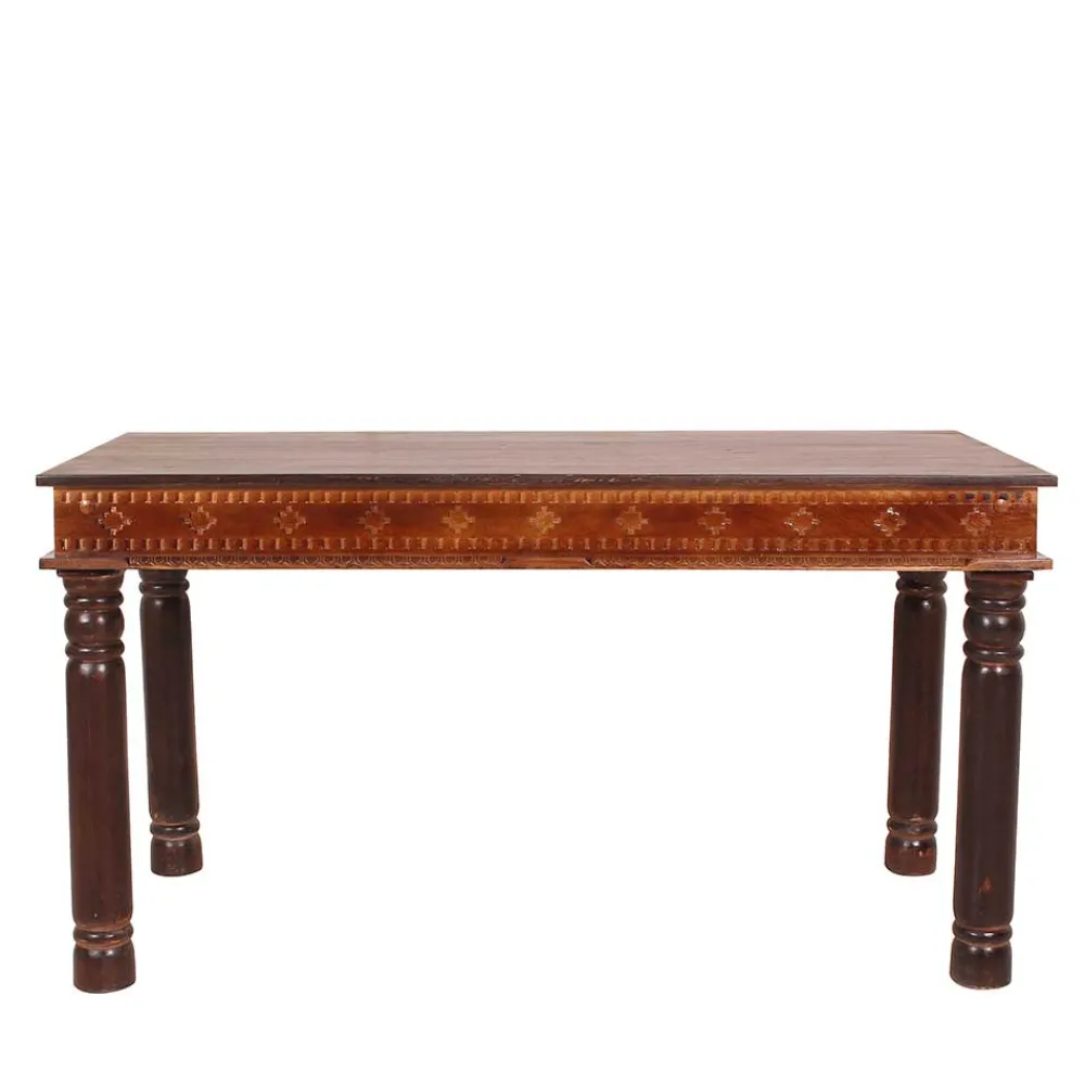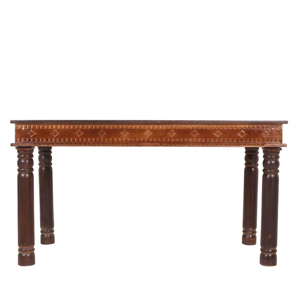 Ein Blick genügt, und Sie werden vom Esstisch „Solapura“ verzaubert sein. Inspiriert von der opulenten Ästhetik des indischen Kolonialstils, verbindet dieses Möbelstück traditionelle Handwerkskunst mit einer Prise Exotik. Der indische Kolonialstil zeichnet sich durch die Verschmelzung europäischer Formen mit indischen Materialien und Verzierungen aus, und genau diese Fusion macht den „Solapura“ zu etwas ganz Besonderem.