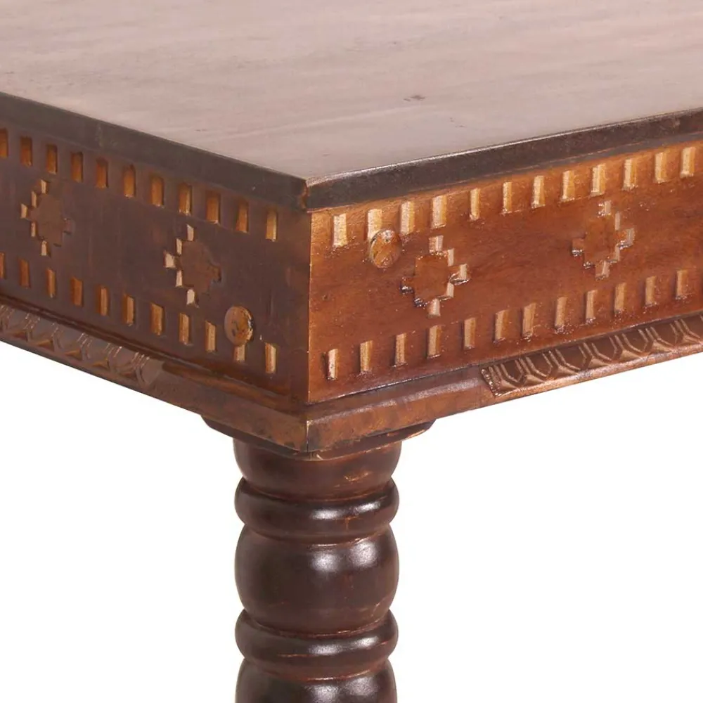 In reinster Handarbeit gefertigt, ist jeder „Solapura“ Esstisch ein Unikat. Die reich beschnitzte Zarge und das aufwändig gedrechselte Vierfußgestell aus massivem Holz zeugen von der hohen Kunst der Tischlerei und verleihen dem Möbelstück seine standfeste Eleganz.