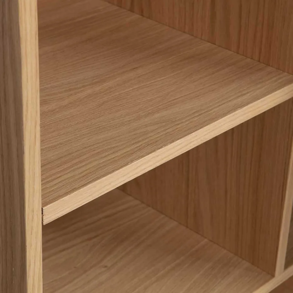 Die Oberfläche des Moduls ist mit einem hochwertigen Echtholzfurnier in Eiche veredelt und matt lackiert. Dieser edle Finish sorgt nicht nur für ein warmes, einladendes Erscheinungsbild, sondern bringt auch die natürliche Maserung des Holzes wunderschön zur Geltung. Beim Berühren spüren Sie die angenehme, sanft strukturierte Oberfläche – fast als würden Sie über echtes Massivholz streichen. Die matte Lackierung schützt das Furnier und verleiht dem Möbelstück eine langlebige, pflegeleichte Oberfläche, die im Alltag mit Robustheit und Eleganz überzeugt.