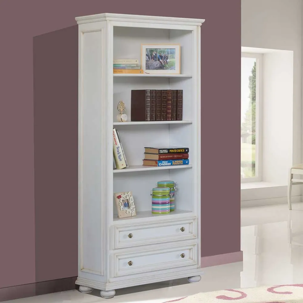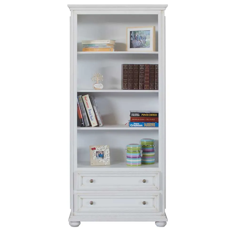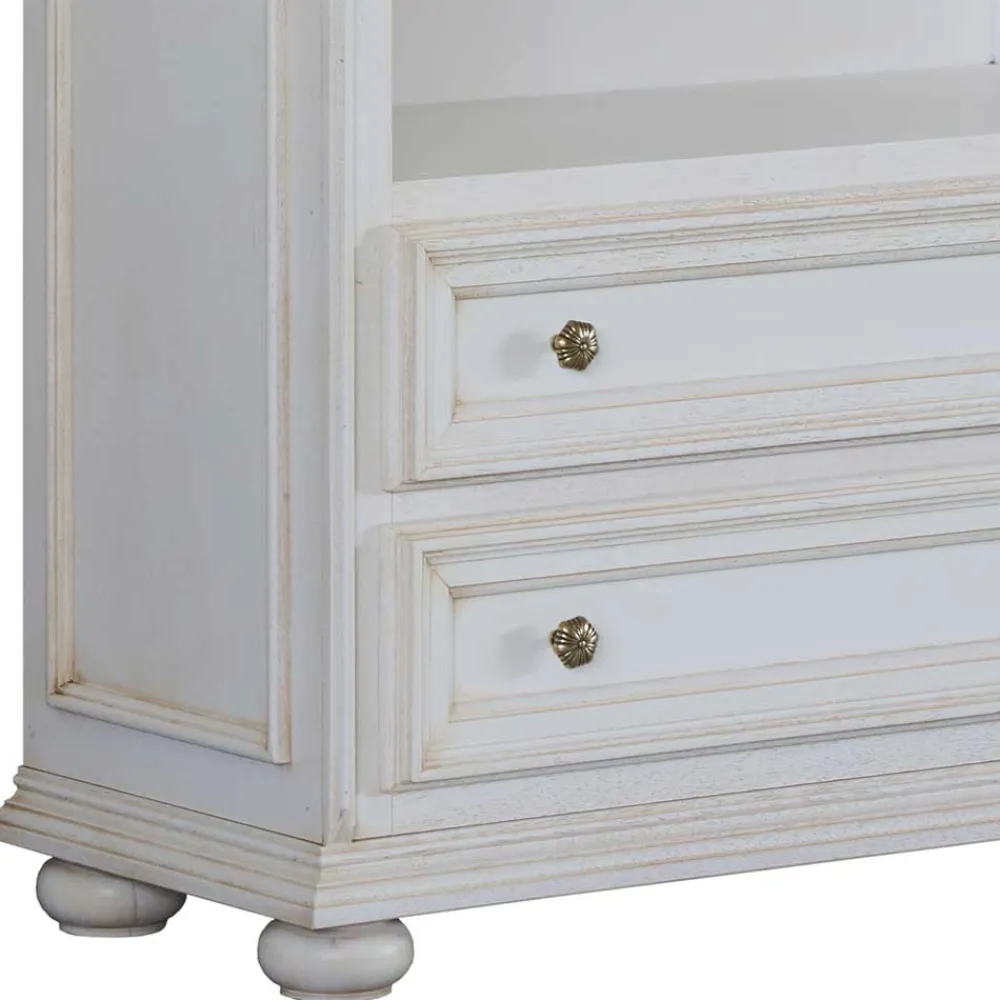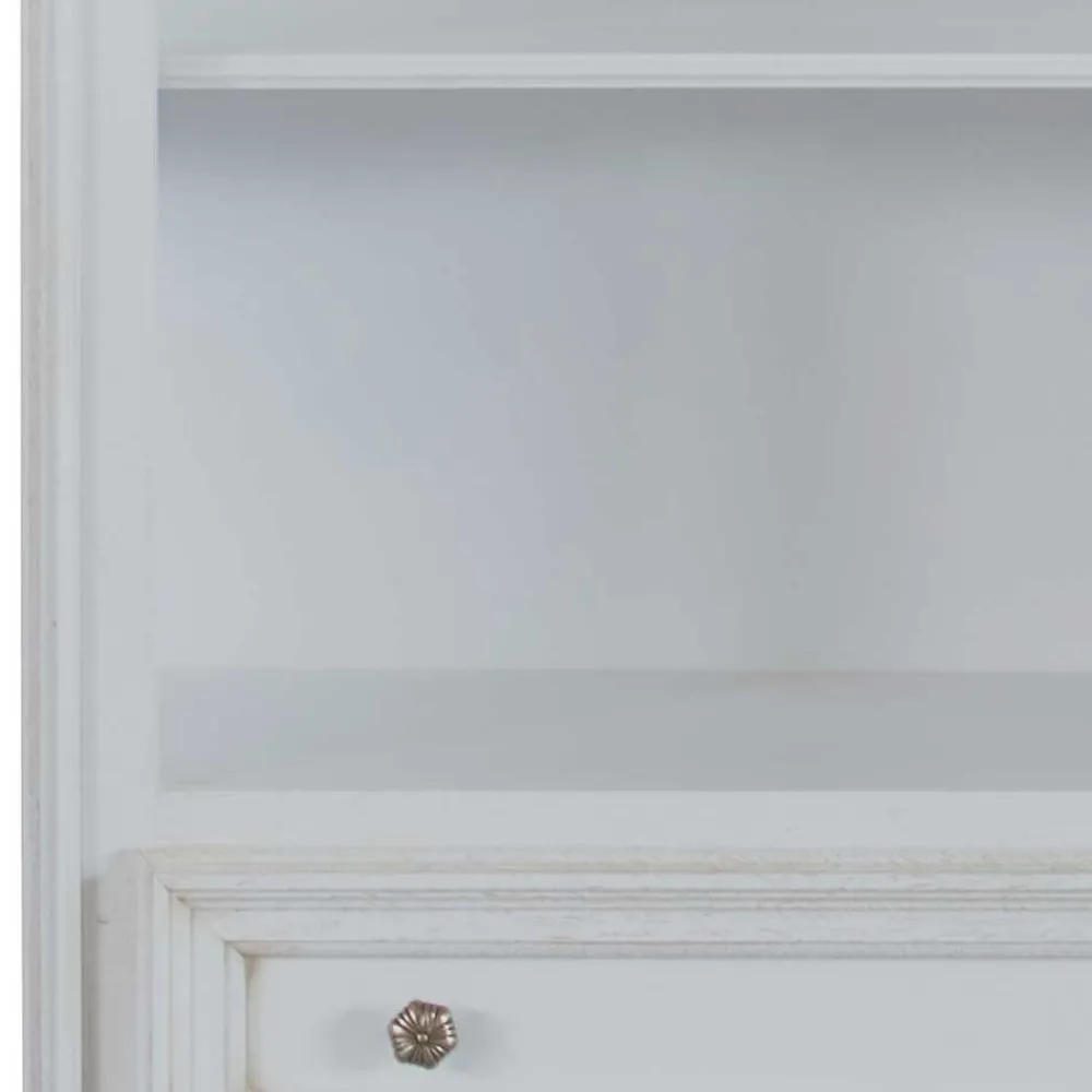 Mit seinem antikweißen Finish und der stilvollen Formgebung fügt sich das Regal „Vicina“ harmonisch in klassische Wohnkonzepte ein. Es bietet eine ideale Möglichkeit, Bücher, Sammlerobjekte oder dekorative Accessoires geschmackvoll zu präsentieren.