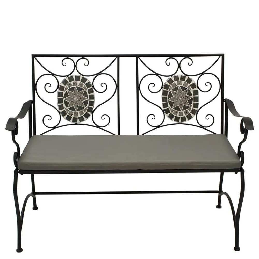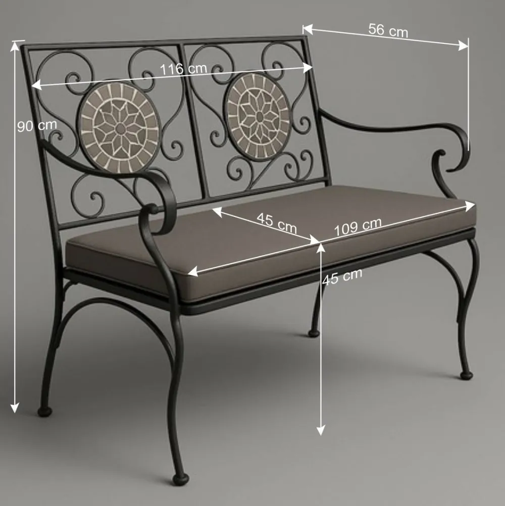 Hergestellt aus hochwertigem Eisen für das stabile Vierfußgestell, Keramik für die kunstvollen Verzierungen und robustem Webstoff für den Bezug, garantiert dieses Möbelstück nicht nur eine edle Optik, sondern auch eine lange Lebensdauer. Eisen überzeugt mit Stabilität und Langlebigkeit, sodass die Bank selbst bei Wind und Wetter standhaft bleibt. Keramik ist bekannt für Widerstandsfähigkeit und filigrane Gestaltung – die Mosaik-Optik der Verzierungen in der Rückenlehne ist ein wahres Meisterwerk der Handwerkskunst. Der Webstoffbezug aus 100 % Polyester bietet zudem exzellente Resistenz gegen Abnutzung und Witterungseinflüsse, was Ihre Bank stets in einem einwandfreien Zustand hält.