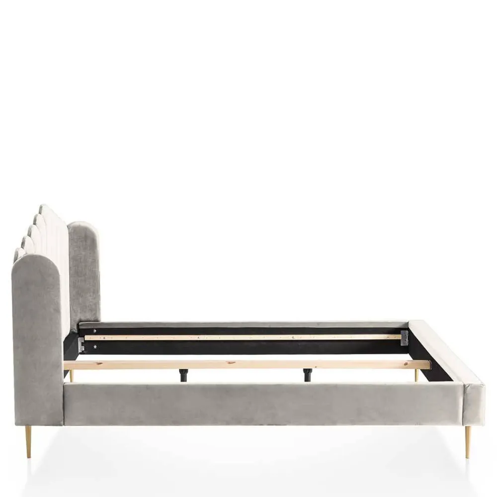 Das filigrane Vierfußgestell aus goldfarbig lackiertem Metall verleiht dem Bett eine schwebende Leichtigkeit und setzt einen modernen Akzent. Mit einer Höhe von 39 cm sorgt das Fußteil nicht nur für eine stilvolle Optik, sondern auch für Stabilität und Komfort. Der Bodenabstand von 18 cm erleichtert zudem die Reinigung unter dem Bett und fördert eine bessere Luftzirkulation – ideal, um Staubansammlungen vorzubeugen.
