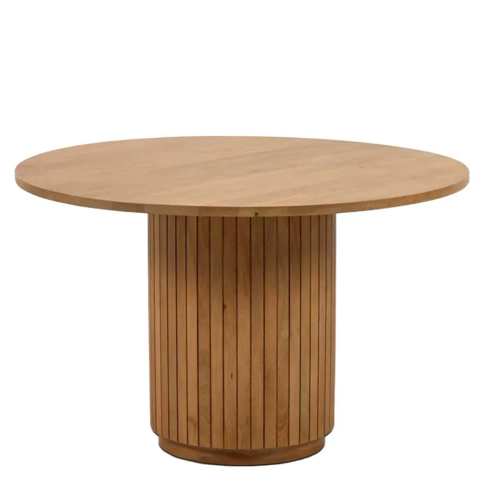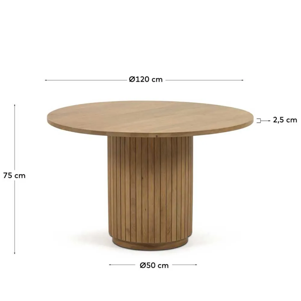 Mit einer Breite von 120 cm, einer Höhe von 75 cm und einer Tiefe von 120 cm bietet der Säulentisch „Ilvenda“ ausreichend Platz für bis zu sechs Personen. Die solide Tischplatte aus massivem Mangobaumholz mit einer Stärke von ca. 2,5 cm garantiert Stabilität und Langlebigkeit. Genießen Sie gemütliche Abende mit Familie und Freunden an diesem großzügigen Tisch.