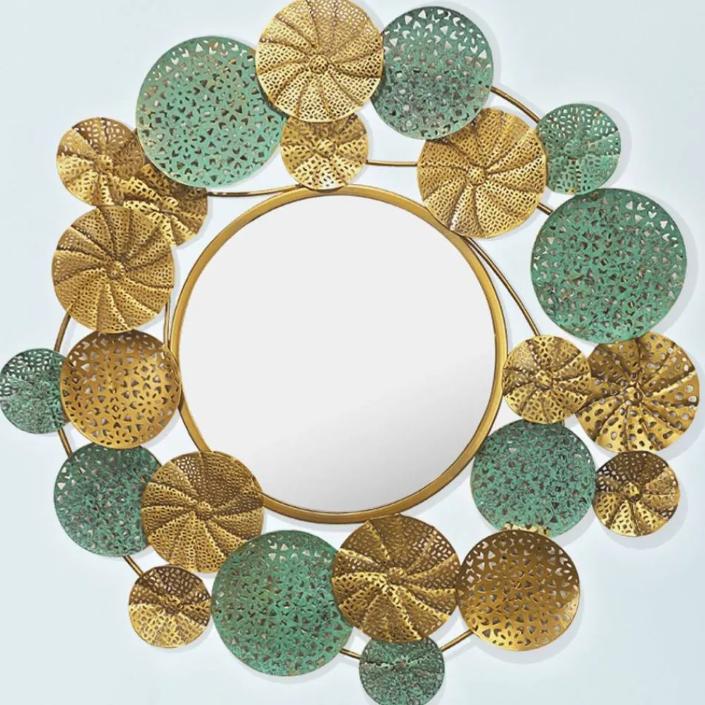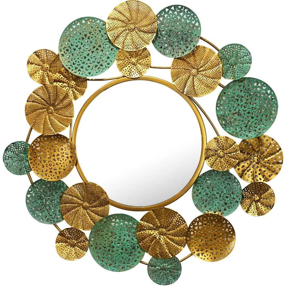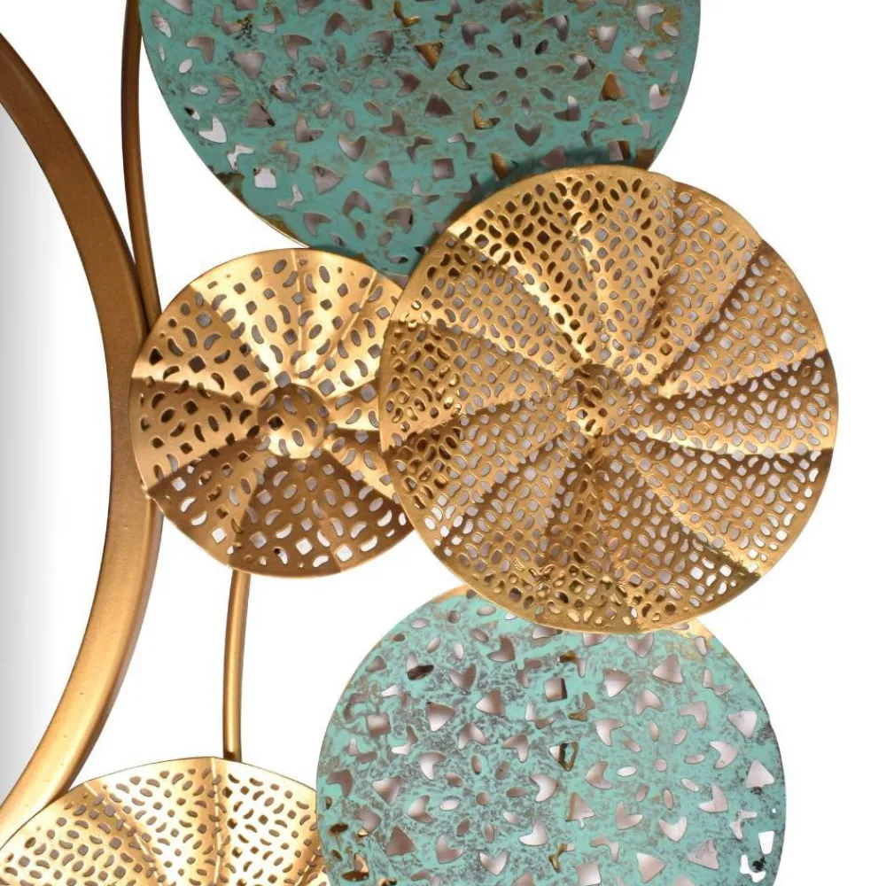 Der Spiegel „Biljana“ besteht aus erstklassigem Spiegelglas und robustem Metall. Der raffiniert gestaltete Metallrahmen besticht durch scheibenförmige Elemente in unterschiedlichen Größen, die sich teils überlappen und eine spannende Struktur bilden. Einige der Scheiben sind gelöchert oder unterschiedlich bearbeitet und setzen mit ihrer teils grünen Patina aufregende Akzente. Diese kunstvolle Gestaltung sorgt für ein optisches Aufbrechen der geometrischen Form und macht den Spiegel zu einem Unikat – leichte Unterschiede zum Foto unterstreichen die Handwerkskunst.