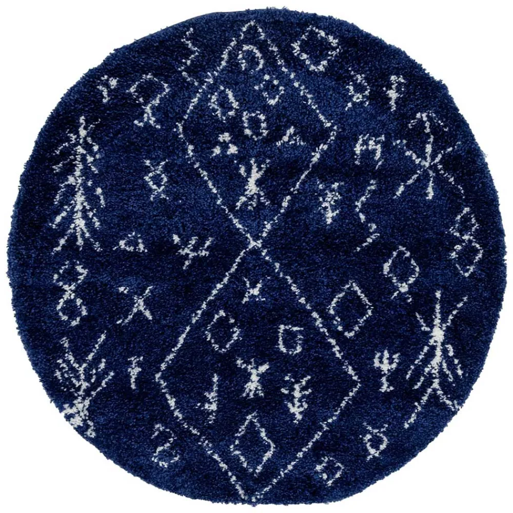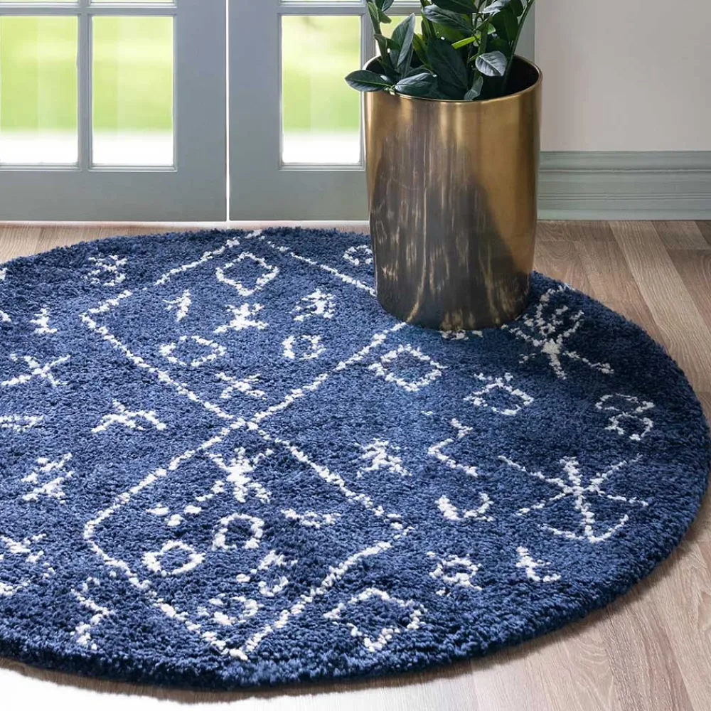 Der runde Hochflor Teppich „Myron“ bringt mit seinem stilvollen Farbspiel aus Blau und Creme eine ruhige, charaktervolle Note in Ihre Wohnräume. Das cremefarbene Ethno-Muster auf tiefblauem Grund wirkt dezent und zugleich ausdrucksstark – ideal für Einrichtungen im Boho Style oder für Räume mit liebevoll zusammengestelltem Ethno Flair. Die runde Form mit 150 cm Durchmesser sorgt für harmonische Übergänge und macht „Myron“ zum textilen Mittelpunkt in Wohn-, Schlaf- oder Leseecken.