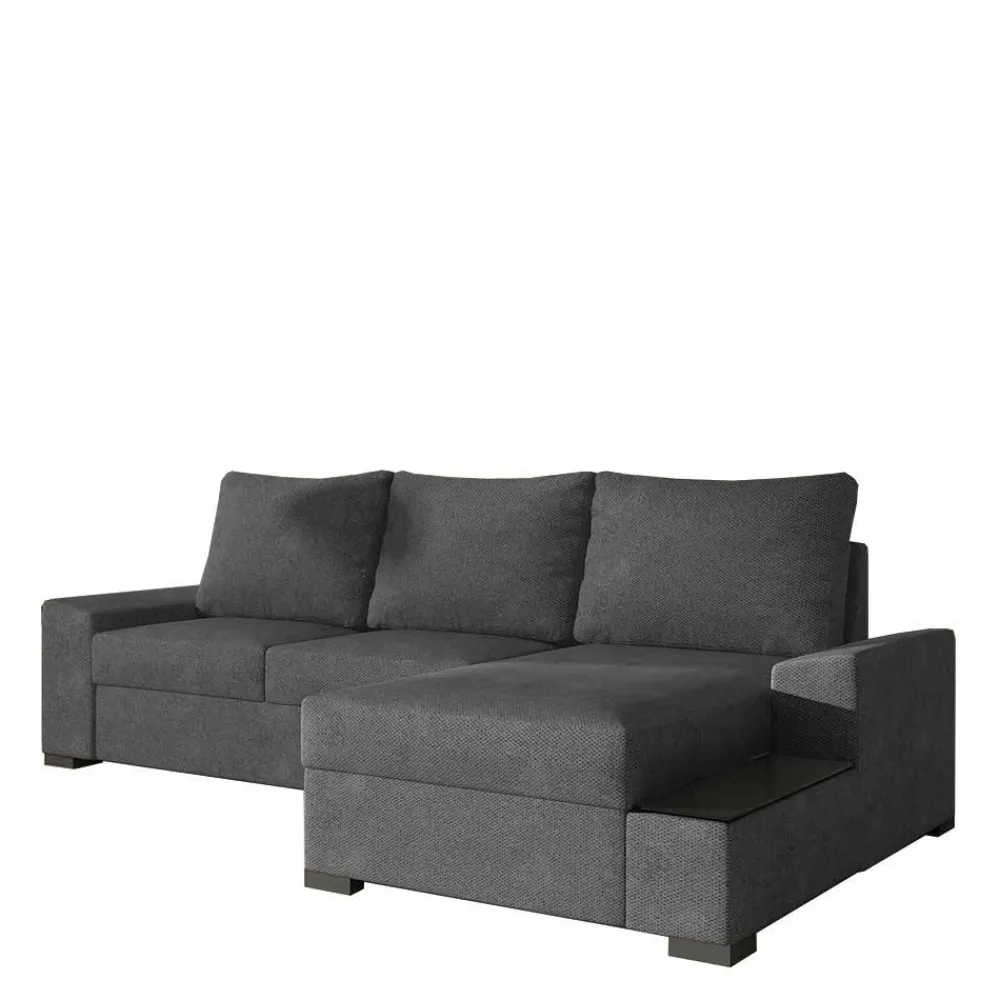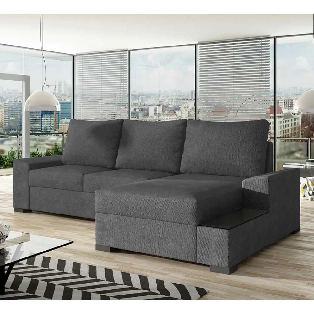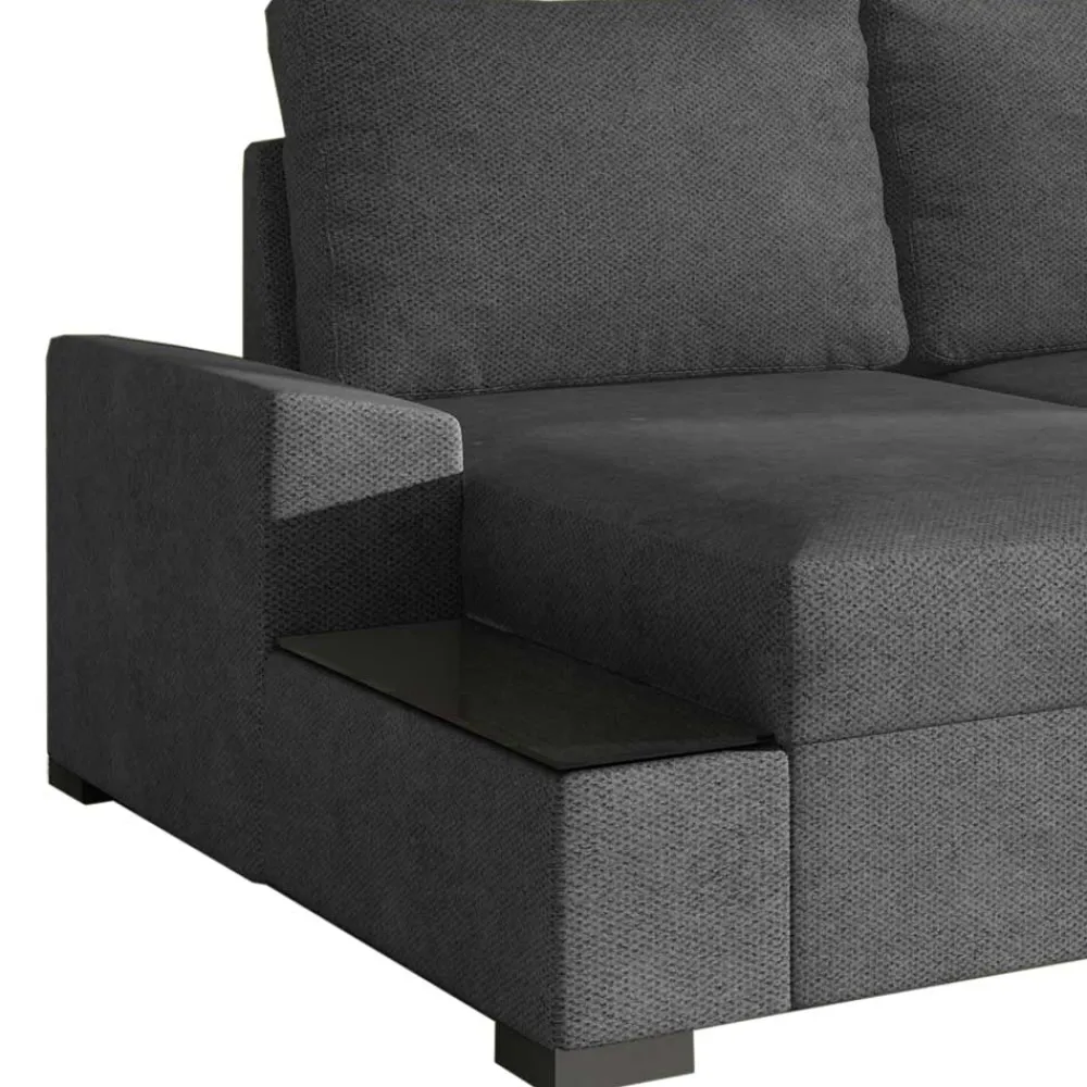 Das Ecksofa „Navarra“ bietet nicht nur als Sitzmöbel höchsten Komfort, sondern verwandelt sich mit wenigen Handgriffen in eine großzügige Liegefläche von 145×200 cm. Ideal für spontane Übernachtungsgäste oder gemütliche Filmabende zu Hause. Unter der Ottomane befindet sich ein geräumiger Bettkasten, der zusätzlichen Stauraum für Bettzeug oder saisonale Dekorationen bietet. Die Ottomane kann je nach Raumschnitt und persönlicher Vorliebe rechts oder links bestellt werden und beinhaltet eine elegante Ablage mit schwarzer Glasplatte, die als praktischer Beistelltisch dient.