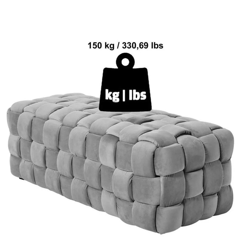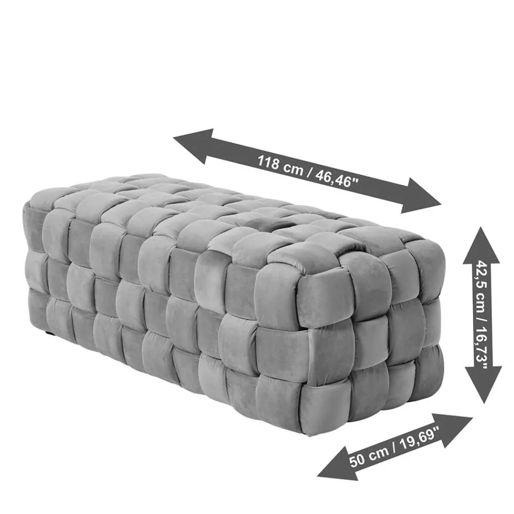 Sie suchen ein Möbelstück, das nicht nur funktional ist, sondern auch durch sein einzigartiges Design überzeugt? Dann ist die Samt-Polsterbank „Josch“ genau das Richtige für Sie! Der sanfte Taupe-Farbton in Kombination mit dem aufwendig gestalteten Flechtdesign macht diese Bank zu einem echten Hingucker. Egal, ob Sie sie im Wohnbereich, Flur oder Schlafzimmer platzieren – die „Josch“ fügt sich mühelos in jede Umgebung ein und bringt modernen Stil in Ihre vier Wände. Dank ihrer rechteckigen Form von 118 cm Länge, 50 cm Breite und 43 cm Höhe lässt sich die Bank sogar als kompakter Couchtisch-Ersatz oder Beistelltisch verwenden.