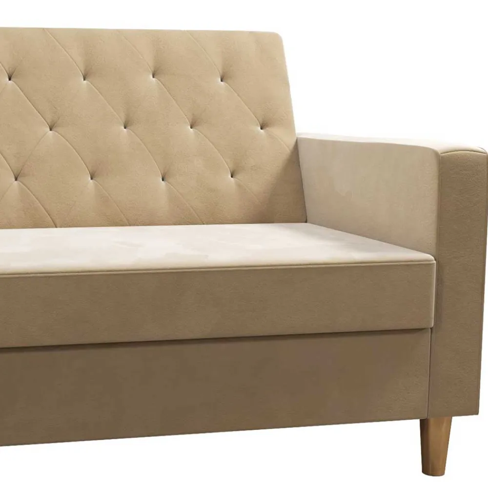 Die feste Polyurethanschaum-Polsterung des Sofas bietet nicht nur hohen Sitzkomfort, sondern behält auch bei intensiver Nutzung ihre Form. Polyurethanschaum ist bekannt für seine Langlebigkeit und Elastizität, wodurch das Sofa immer wieder in seine ursprüngliche Form zurückkehrt. Der cremefarbene Samtbezug aus 100 % Polyester ist nicht nur besonders strapazierfähig, sondern auch pflegeleicht. Samt verleiht dem Sofa eine luxuriöse Optik und eine weiche, angenehme Haptik, während tiefe Punktsteppungen und kapitonierte Nähte das edle Design abrunden. Der Bezug ist zudem leicht zu reinigen und resistent gegen Abnutzung, was ihn ideal für den täglichen Gebrauch macht.