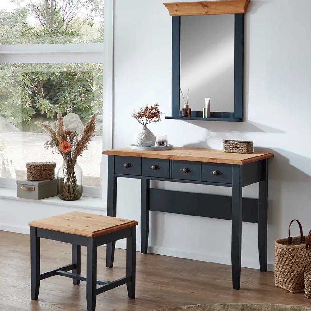 Sie legen Wert auf Stil und Gemütlichkeit? Dann ist das Schminktisch Set „Strada“ die perfekte Ergänzung für Ihr Zuhause. Mit seinem zweifarbigen Look in Schwarz und Kiefer Laugenfarbig strahlt es eine behagliche Atmosphäre aus, die jeden Raum aufwertet.