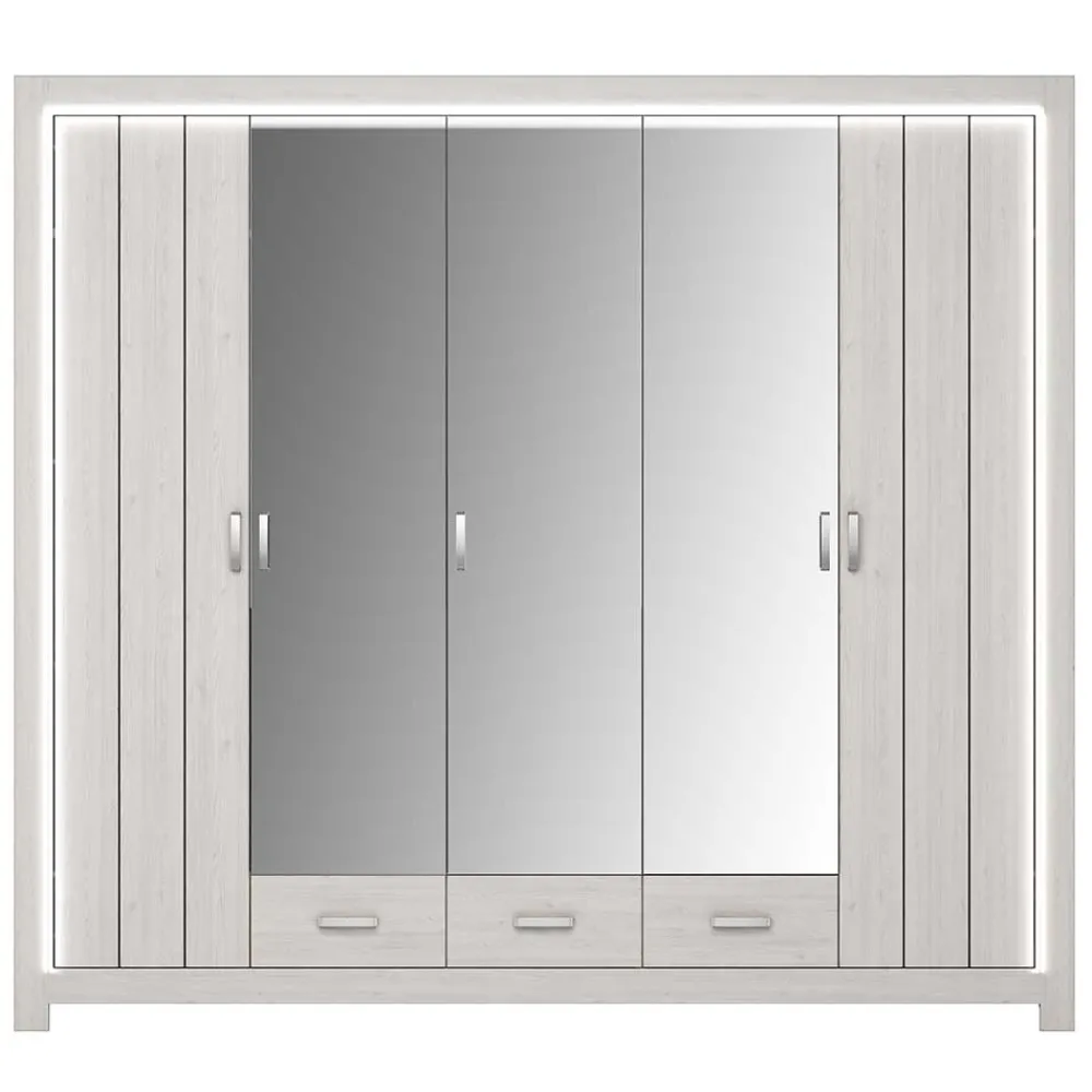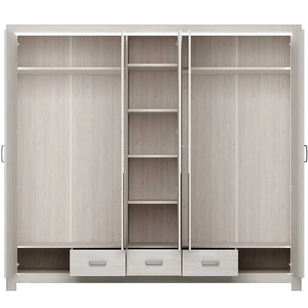 - Hinter der mittleren Tür fünf Einlegeböden, hinter den Doppeltüren außen jeweils ein Boden und eine Kleiderstange