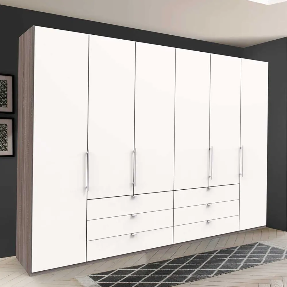 Links und rechts verfügt der Schrank über Drehtüren mit gedämpften Metallbeschlägen, die für ein sanftes Schließen sorgen. Mittig faszinieren zwei Panorama-Falttüren in Vier-Türen-Optik, die beim Öffnen platzsparend nach vorne gezogen werden. Hinter diesen Türen verbergen sich vier Facheinheiten, jeweils ausgestattet mit zwei Einlegeböden und einer stabilen Kleiderstange aus Metall. Zusätzlich sind sechs mittige Schubkästen integriert, die mit einem Metallauszug überzeugen. Dank der Soft Close-Technik schließen diese Schubkästen sanft und der Selbsteinzug sorgt dafür, dass sie von alleine einrasten, wenn sie nahezu geschlossen sind.