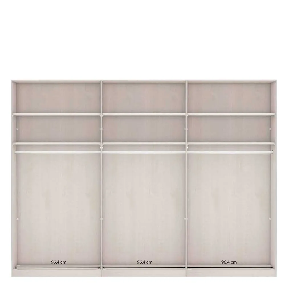 Der großzügige Schrank mit den Maßen 310x221x69 cm bietet durch zwei platzsparende Schwebetüren und drei Facheinheiten viel Platz für Ihre Kleidung und Accessoires. Jede Facheinheit hat eine Breite von 96,4 cm und ist mit zwei Einlegeböden sowie einer Kleiderstange ausgestattet. Die langen Griffleisten aus Metall in Dunkelgrau setzen dezente Akzente und unterstreichen das elegante Design. Mit dem inkludierten Passepartoutrahmen (Maße ohne Passepartout: 300x217x67 cm, Breite je Seitenstollen: 5 cm) erhält der Schrank eine zusätzliche Tiefe und Ausdruckskraft.