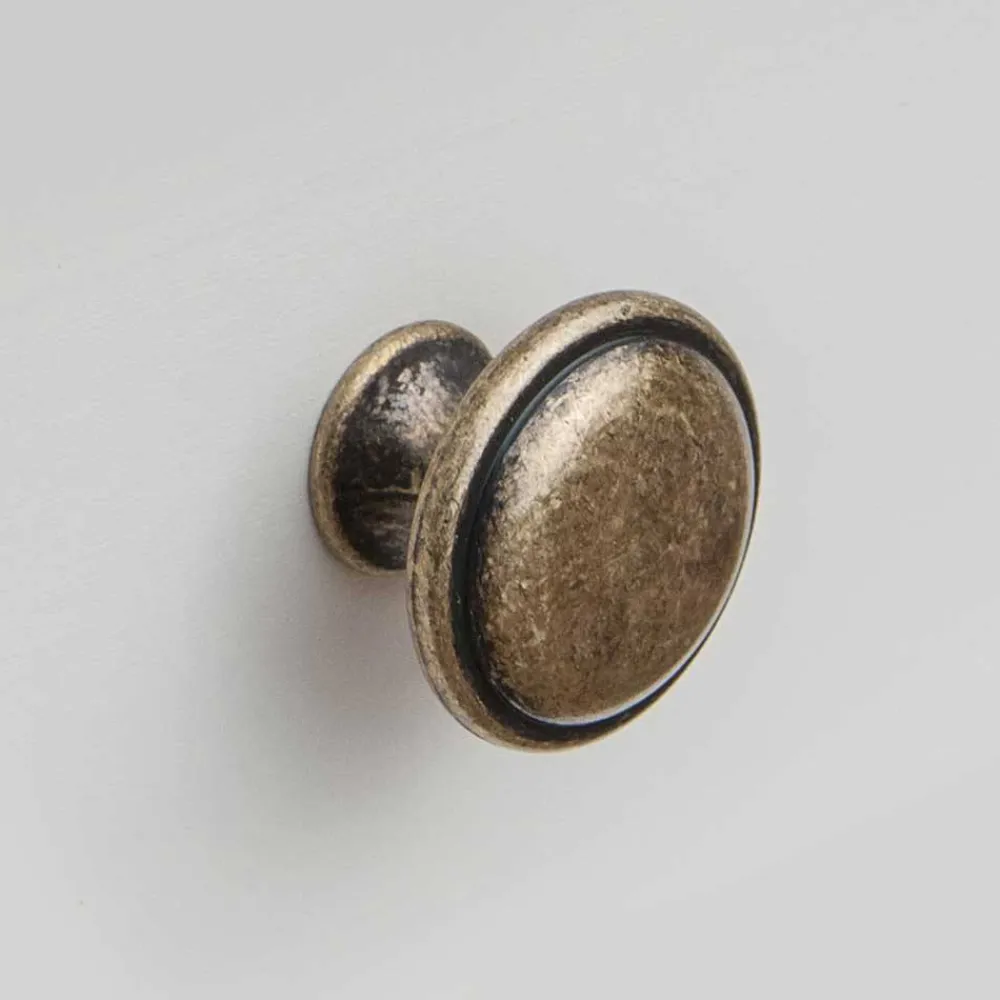 Zwischen den Türen befindet sich eine praktische Schublade mit einem Metallauszug und einer Soft-Close-Funktion, die ein leises und sicheres Schließen gewährleistet. Die runden Knopfgriffe in Altmessingfarben fügen sich nahtlos in das elegante Design ein und bieten eine bequeme Handhabung.