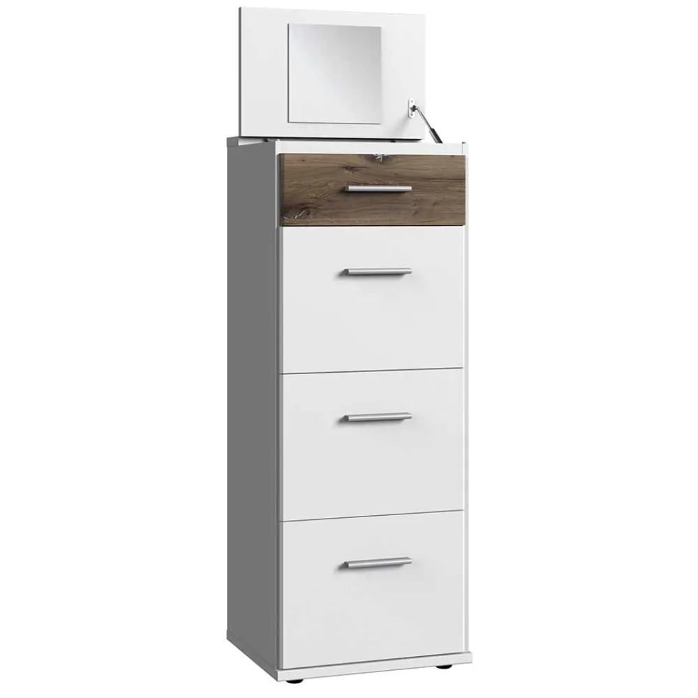 Mit ihren kompakten Maßen von 48 cm Breite, 197 cm Höhe und 40 cm Tiefe fügt sich „Liesca“ harmonisch auch in kleinere Räume ein und schafft dabei überraschend viel Platz für Ihre Beauty-Essentials. Die oberste Schubladenfront in verwitterter Eiche-Holzoptik setzt einen stilvollen Akzent zur sonst weiß folierten Oberfläche – ein moderner Look, der sich vielseitig kombinieren lässt. Die unempfindliche, folierte Oberfläche ist nicht nur pflegeleicht, sondern widerstandsfähig gegen Kratzer und Alltagsabnutzung – ideal für den täglichen Gebrauch.