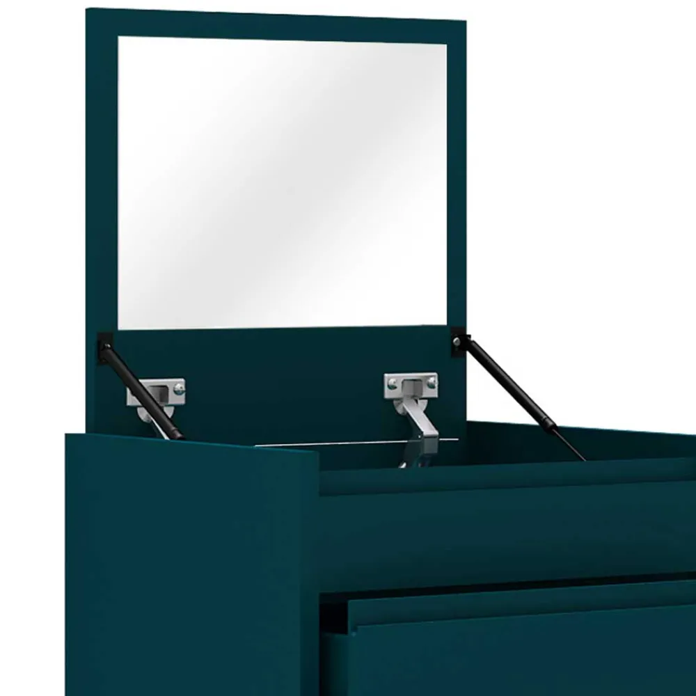 - Die Deckplatte lässt sich hochklappen, darunter befindet sich ein Spiegel und eine Ablage für Kosmetika, gedämpfte Metallbeschläge