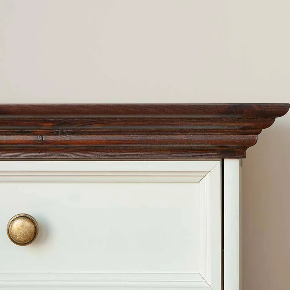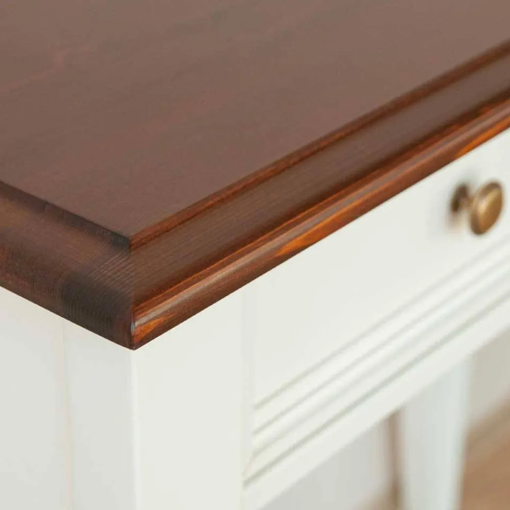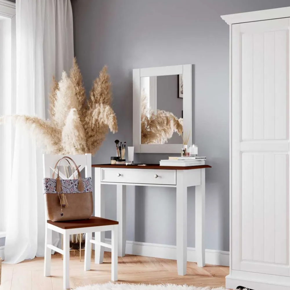 Das Design im Landhausstil bringt eine helle, freundliche Atmosphäre in Ihr Schlafzimmer oder Ankleidezimmer. Landhausstil zeichnet sich durch klare Linien, natürliche Materialien und gemütliche Farbtöne aus, was den Frisiertisch zu einem zeitlosen Stück macht, das Modernität und Tradition perfekt vereint. Die nussbaumfarbene Tischplatte mit gefrästen Kanten bildet einen eleganten Kontrast zum weißen Unterbau und verleiht dem Ganzen eine exquisite Note.