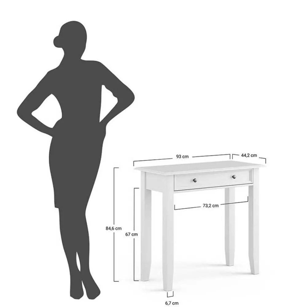 Der Frisiertisch bietet mit seinen Maßen von 93 cm Breite, 85 cm Höhe und 45 cm Tiefe ausreichend Platz für all Ihre Utensilien. Ausgestattet mit einer geräumigen Schublade, die über einen Metallauszug mit Soft-Close-Funktion verfügt, können Sie Ihre Beauty-Produkte sanft und geräuschlos verstauen. Der Schubladenboden aus Sperrholz verspricht zusätzliche Stabilität und Langlebigkeit.