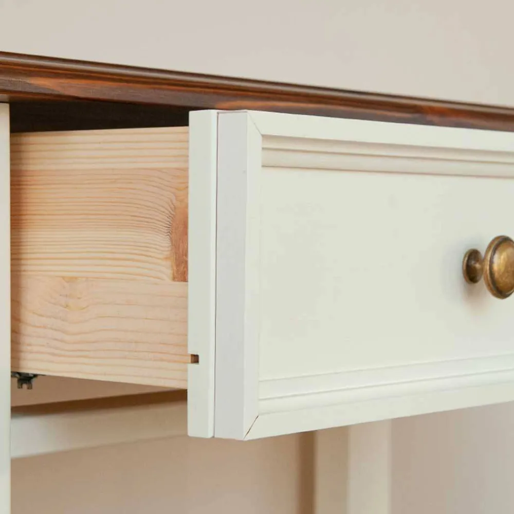 Massives Kiefernholz ist bekannt für seine Robustheit und Haltbarkeit, was den Frisiertisch „Manipur“ zu einer Investition fürs Leben macht. Die natürliche Maserung des Holzes bringt Wärme und Naturverbundenheit in jeden Raum, während die wasserbasierte Lackierung in strahlendem Weiß (RAL 9010) mit einer Deckkraft von 85 % den Tisch pflegeleicht und umweltfreundlich macht. Diese Oberflächenbehandlung schützt das Holz nicht nur, sondern unterstreicht auch die hochwertige Optik des Tisches.