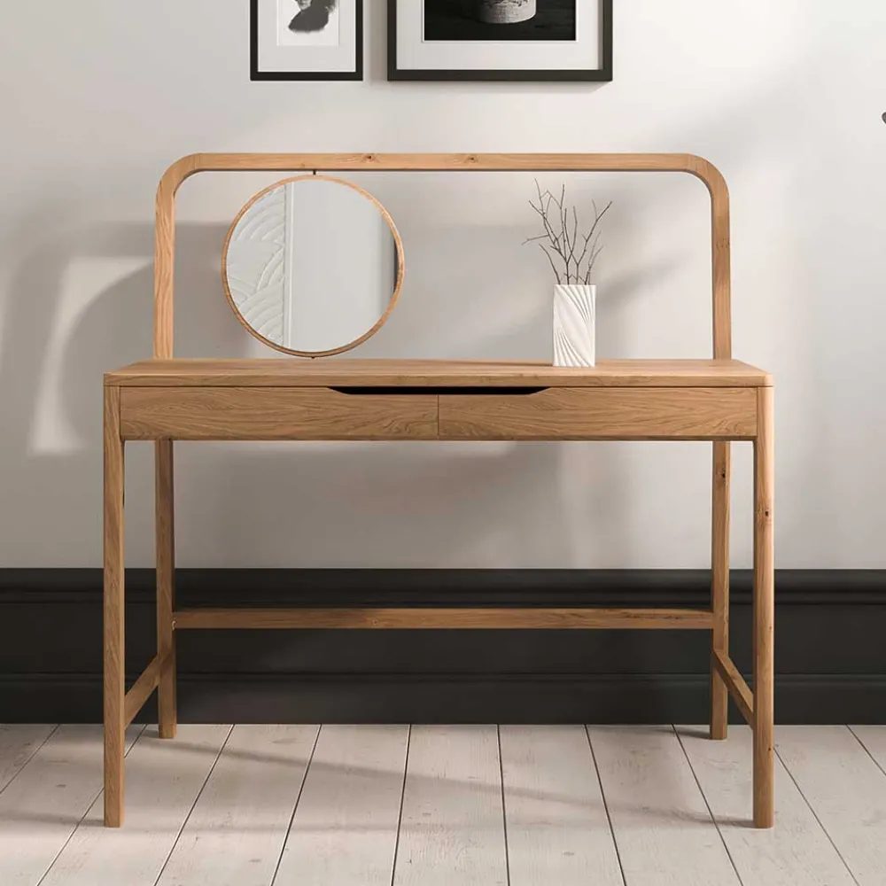 Ein stilvolles Möbelstück, das Funktionalität und Ästhetik perfekt vereint. Der Frisiertisch Laida begeistert mit seinem modern-natürlichen Design und bringt die Schönheit massiver Wildeiche in Ihr Zuhause. Durch die geölte Oberfläche wird die einzigartige Maserung des Holzes betont, wodurch jeder Tisch zu einem unverwechselbaren Unikat wird.