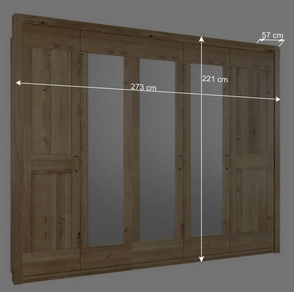 Mit einer Höhe von 221 cm, einer Tiefe von 57 cm und einer Breite von 249 cm bietet der Kleiderschrank „Zamron“ viel Stauraum für Ihre Kleidung und Accessoires. Er verfügt über insgesamt fünf Türen mit stabilen Metallbeschlägen, die für eine reibungslose Handhabung sorgen. In der Mitte des Schrankes befinden sich drei Spiegelelemente, die nicht nur praktisch sind, sondern auch ein Gefühl von Weite und Helligkeit vermitteln.