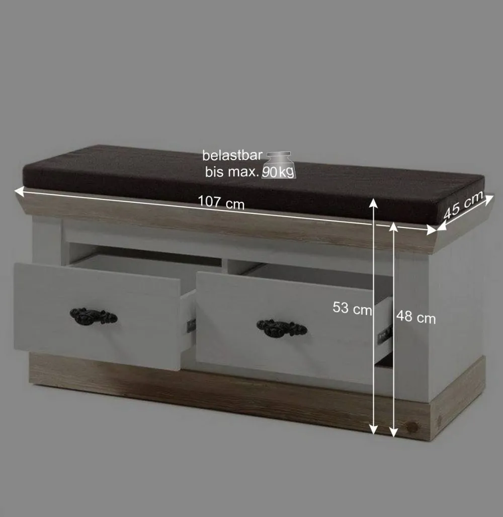 Die Liebe zum Detail zeigt sich in den schwarzen Metallgriffen, die mit antik anmutenden Verzierungen versehen sind. Diese Griffe setzen einen stilvollen farblichen Akzent zum weißen Design der Möbel. Die Sitzbank ist inklusive eines bequemen Sitzkissens, das nicht nur für Gemütlichkeit sorgt, sondern auch das Gesamtbild harmonisch abrundet.