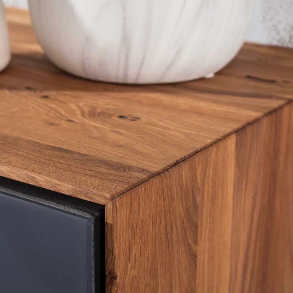 - Hergestellt aus Wildeiche Massivholz, MDF und Glas