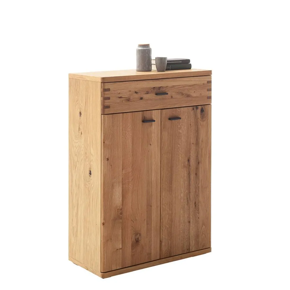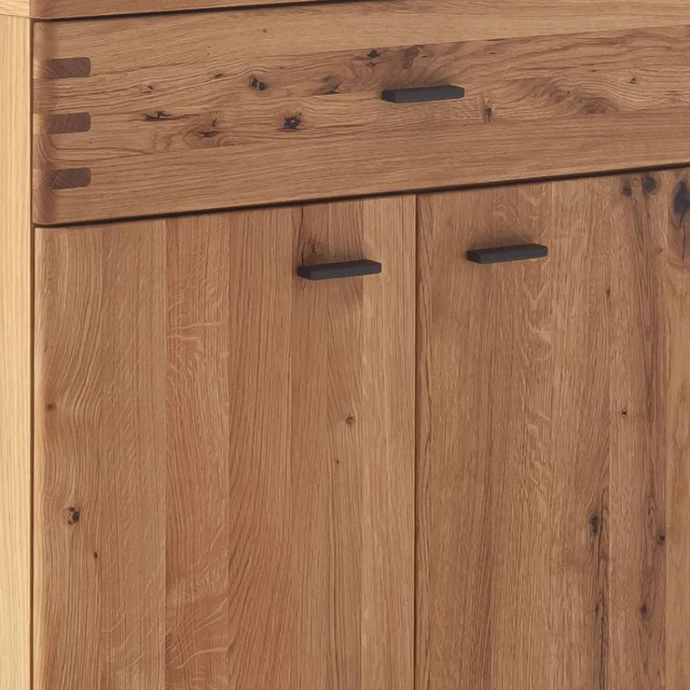 - Aus Balkeneiche Massivholz (Front) und Spanplatte (Korpus) gefertigt