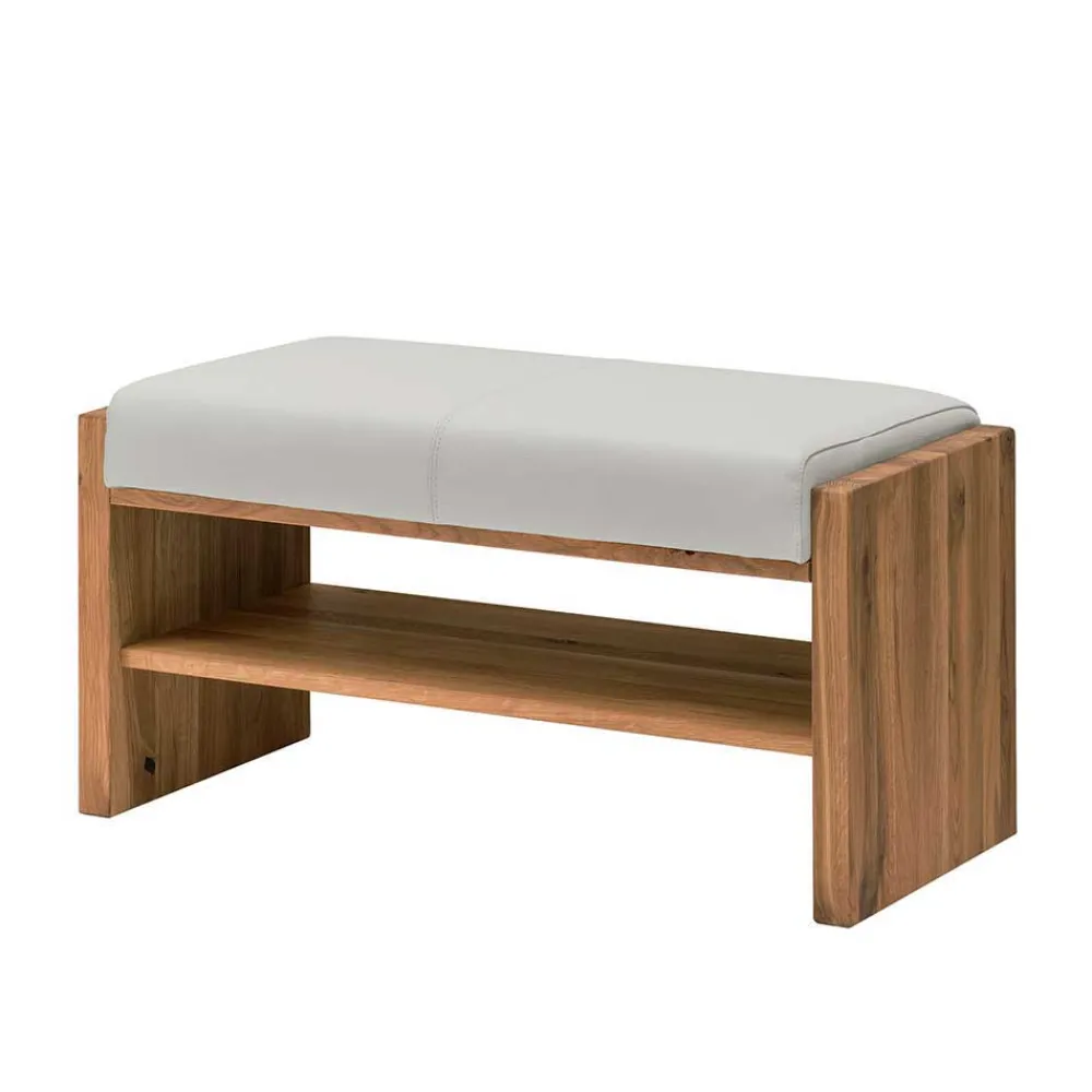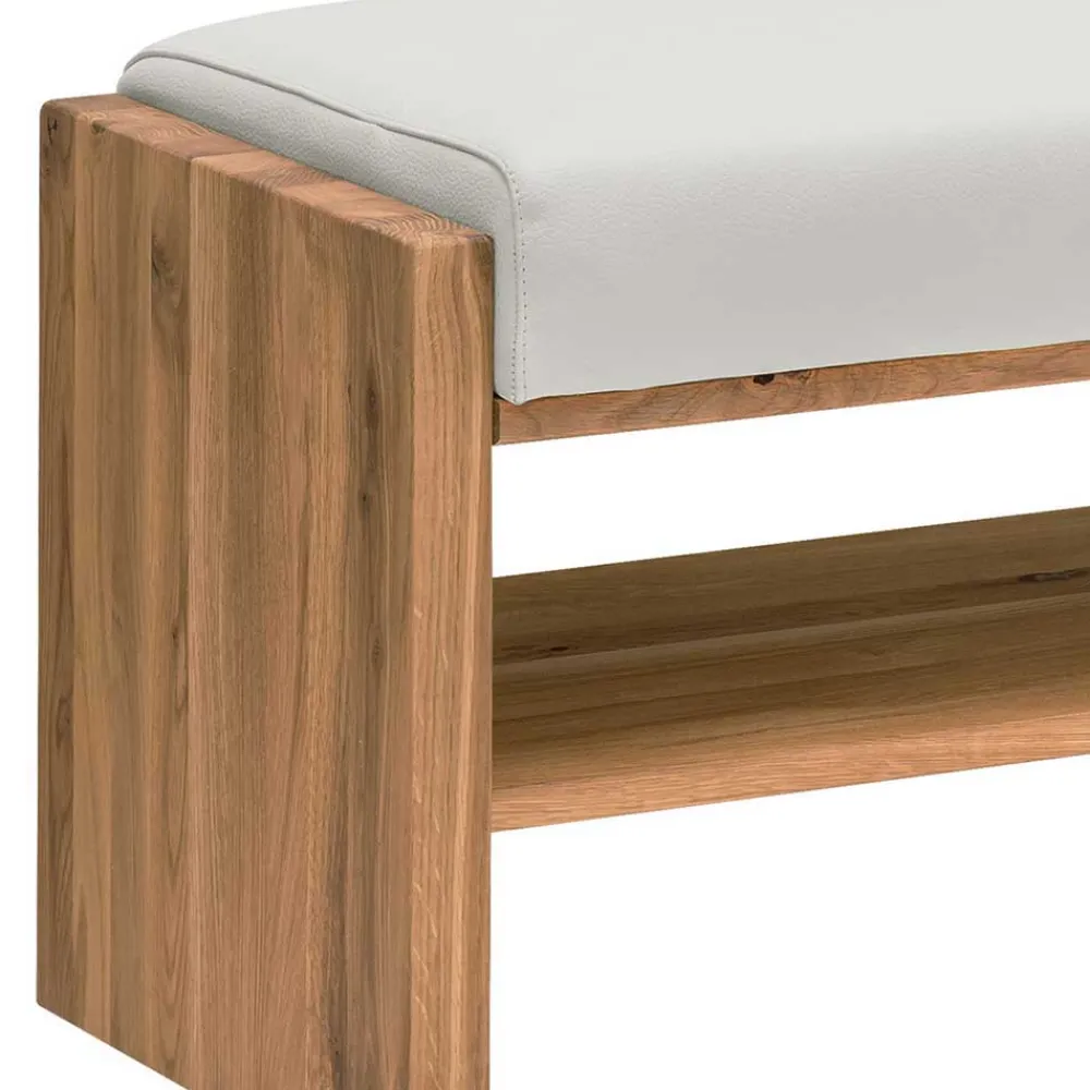 Die Schuhbank „Mandrey“ besteht aus massivem Wildeicheholz und Echtleder, was sie zu einem beeindruckenden Blickfang in Ihrem Eingangsbereich macht. Natürliche Wuchsmerkmale wie leichte Risse oder Astlöcher sind bewusst integriert und verleihen den Möbeln einen unverwechselbaren Charakter. Die gebürsteten und geölten Holzoberflächen betonen die lebhafte Maserung und verleihen der Schuhbank einen zeitgemäßen Look.