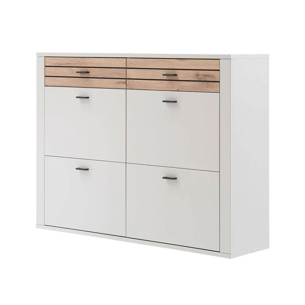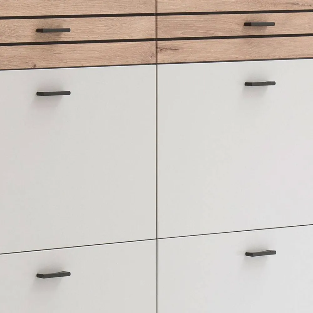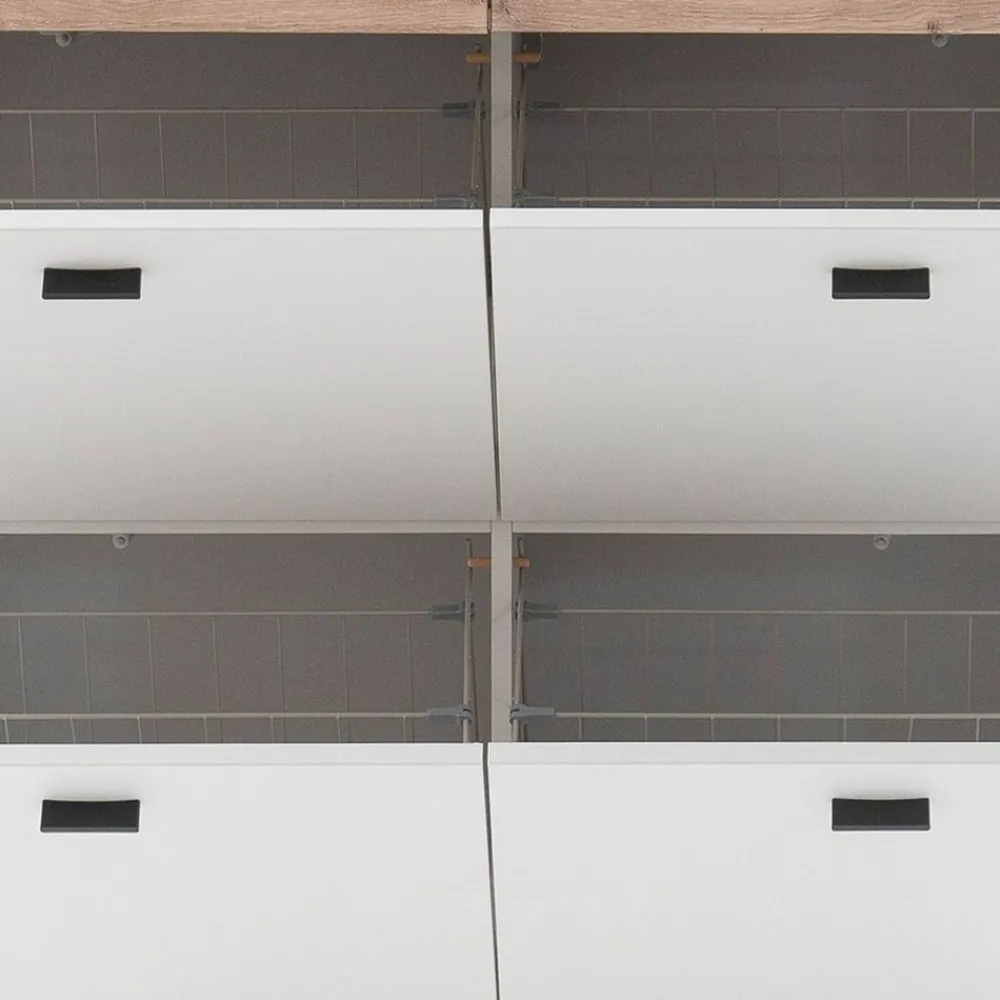 Im oberen Bereich bieten zwei leichtgängige Schubladen mit Metallauszug, Unterflurführung und Soft-Close-Funktion praktischen Platz für kleinere Accessoires. Darunter befinden sich vier Schuhklappen mit gedämpften Metallbeschlägen, die jeweils einen Doppel-Metallschuhkorb beherbergen – ideal für die platzsparende Aufbewahrung von bis zu 16 Paar Schuhen bis Größe 39.