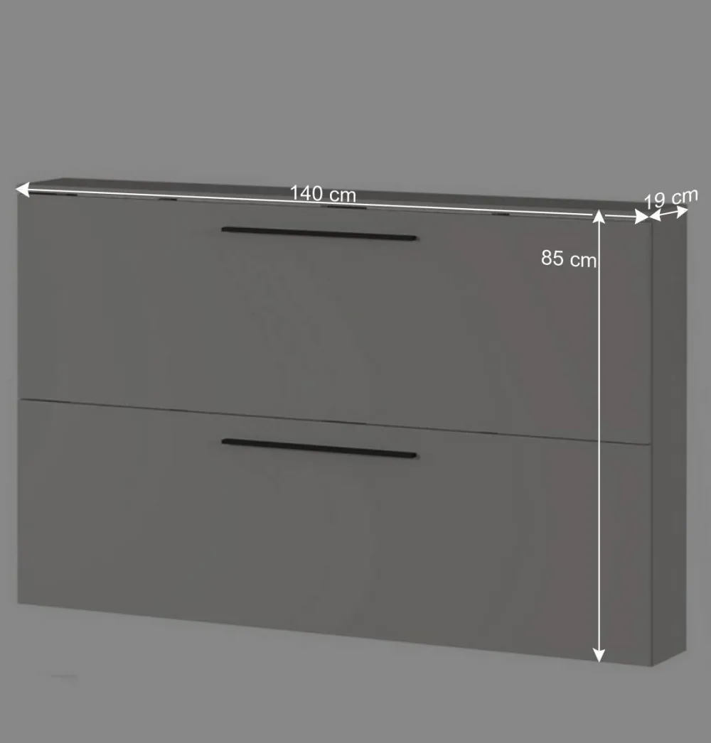 Mit Maßen von 140 cm Breite, 85 cm Höhe und nur 19 cm Tiefe, ist der „Orica“ speziell dafür konzipiert, auch in begrenzten Räumen eine ausgezeichnete Figur zu machen. Zwei großzügige Schuhklappen bieten Platz für bis zu zwölf Paar Schuhe. Im Inneren sorgen robuste Metall-Schuhkörbe dafür, dass Ihre Schuhe immer optimal gelagert sind. Die langen Steggriffe in elegantem Schwarz unterstreichen das moderne Design und erleichtern die Handhabung.