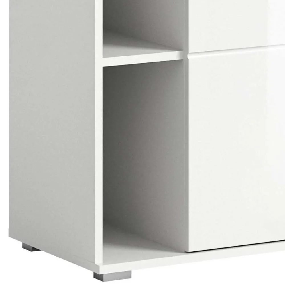 Holzwerkstoff bildet die Grundlage dieses Möbelstücks und überzeugt durch seine Robustheit und Umweltfreundlichkeit. Dieser moderne Werkstoff besteht aus nachhaltig gewonnenen Holzfasern und ist für seine Stabilität und Formtreue bekannt. Die matte Folierung des Korpus schützt nicht nur die Oberfläche, sondern verleiht ihr eine sanfte Haptik und macht sie leicht zu reinigen. Gleichzeitig begeistert die hochglänzende Front mit ihrer widerstandsfähigen Beschichtung, die nicht nur edel aussieht, sondern auch im Alltag durch ihre Pflegeleichtigkeit punktet.