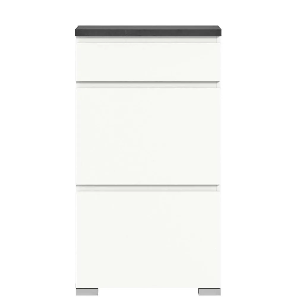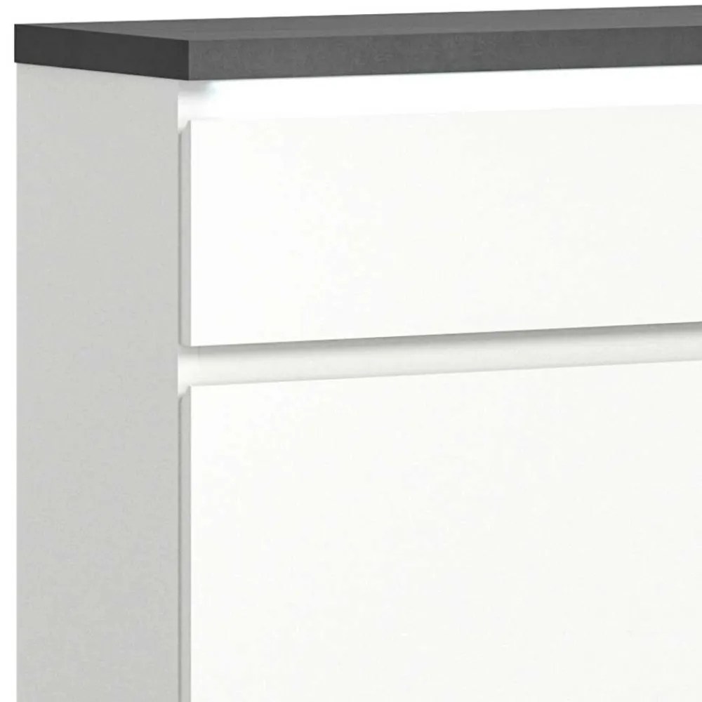Weiß und Dunkelgrau, eine Farbkombination, die schlichte Eleganz und Modernität ausstrahlt. Der Korpus und die Fronten des Schuhschranks erstrahlen in einem klaren, pflegeleichten Weiß, während die Deckplatte in einem eleganten Dunkelgrau Akzente setzt. Diese harmonische Farbgebung macht den Schuhschrank zu einem vielseitigen Möbelstück, das sich mühelos in verschiedene Einrichtungsstile integrieren lässt, sei es modern, skandinavisch oder klassisch.