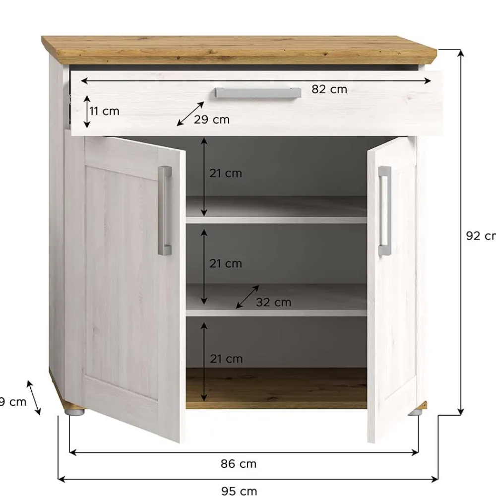 Die „Tocella“ Schuhkommode verbindet funktionalen Stauraum mit einem eleganten Design im Landhausstil. Mit einer Breite von 95 cm, einer Höhe von 92 cm und einer Tiefe von 39 cm fügt sie sich harmonisch in Ihr Zuhause ein. Die Kombination aus Holzoptik Lärche Weiß und Absetzungen in Wildeichefarben sorgt für ein warmes, einladendes Ambiente in Ihrem Flur oder Eingangsbereich.