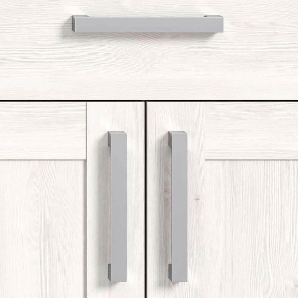 Gefertigt aus hochwertiger Spanplatte, verfügt die „Tocella“ Schuhkommode über eine Schublade mit Metallauszug sowie zwei Drehtüren mit stabilen Metallscharnieren. Die Front ist in Holzoptik Lärche Weiß foliert und der Korpus melaminbeschichtet, was die Kommode besonders pflegeleicht macht. Absetzungen in Wildeiche verleihen der Kommode einen natürlichen Charme, während die silberfarbenen Kunststoff Bügelgriffe die moderne Optik abrunden.