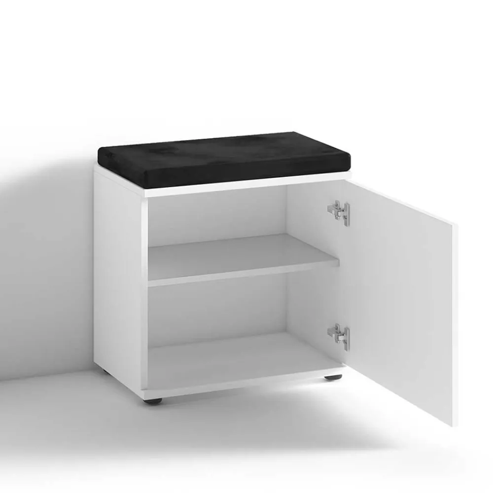 Die Schuhbank „Massa“ überzeugt durch hochwertige Materialien und sorgfältige Verarbeitung. Der pflegeleichte Kunstlederbezug aus 100 % Polyurethan in Schwarz setzt nicht nur optisch Akzente, sondern ist auch äußerst strapazierfähig. Die weißen Oberflächen sind melaminharzbeschichtet und verleihen der Bank eine edle Note.