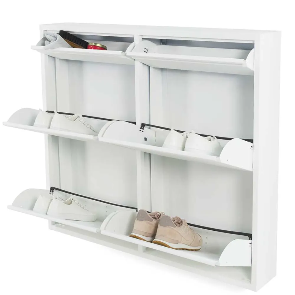 Mit nur 15 cm Tiefe gehört Cioara zu den schlanksten Vertretern seiner Art und bietet dennoch erstaunlich viel Stauraum. Die vier Klappen (je Seite synchron öffnend) nehmen bis zu acht Paar Schuhe auf – optimal für Alltagsschuhe ohne Absatz und geeignet bis Schuhgröße 44/45. Zwei zusätzliche Fächer an der Oberseite bieten Platz für Handschuhe, Schlüssel oder Accessoires, die stets griffbereit sein sollen.