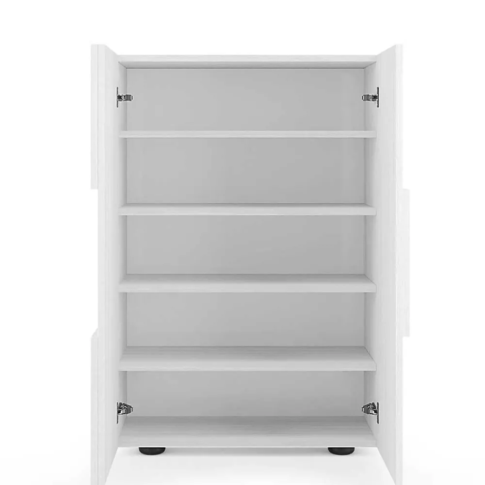 Schuhe geordnet und griffbereit verstauen – „Hollie“ macht es möglich! Hinter zwei stabilen Türen mit langlebigen Metallbeschlägen verbergen sich vier praktische Einlegeböden. Diese bieten Platz für bis zu 15 Paar Schuhe, abhängig von Größe und Modell. Ob Sneaker, Stiefeletten oder Pumps – alles findet seinen Platz und bleibt vor Staub geschützt. Die durchdachte Innenaufteilung ermöglicht zudem eine einfache Organisation.