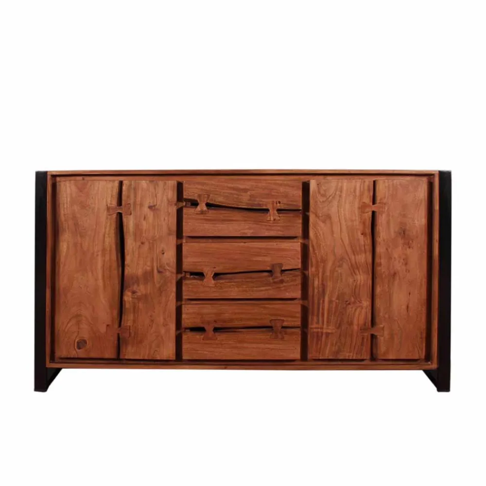 Neben seiner beeindruckenden Optik bietet die Anrichte „Smantana“ praktischen Stauraum und Organisation. Mit einer Breite von 200 cm, einer Höhe von 80 cm und einer Tiefe von 40 cm, ausgestattet mit zwei Türen und drei Schubkästen, bietet dieses Möbelstück reichlich Platz für Ihre Wohnbedürfnisse. Die Schubladen und Türen, verziert mit einzigartigen Schwalbenschwanz-Verbindungen, sprechen für die Qualität und das Auge fürs Detail, das in jedes unserer Produkte fließt.