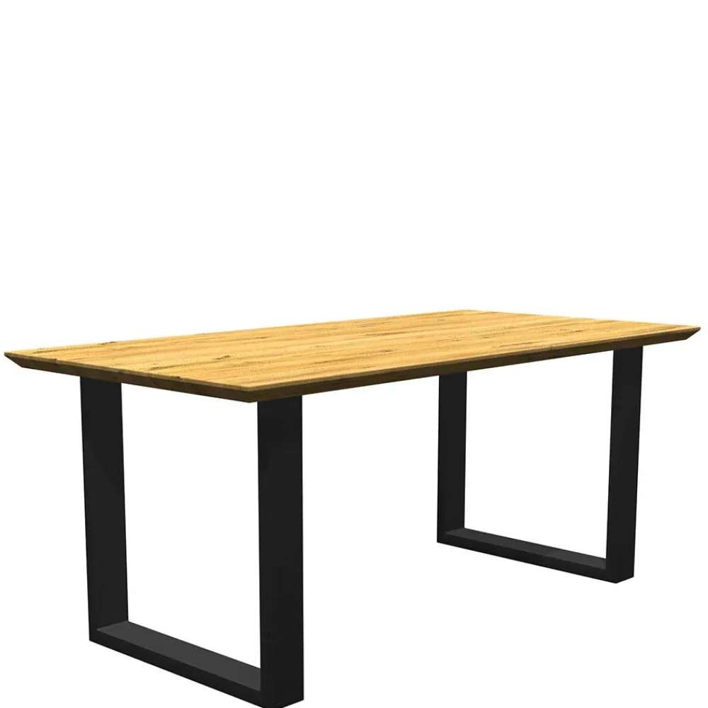 Die etwa 4 cm starke Eichenplatte des Tisches Blacer ist aufwendig mit Schweizer Kante gearbeitet. Sie wird durch ein solides Metallgestell in Form von zwei U-Füßen sicher und stabil getragen.