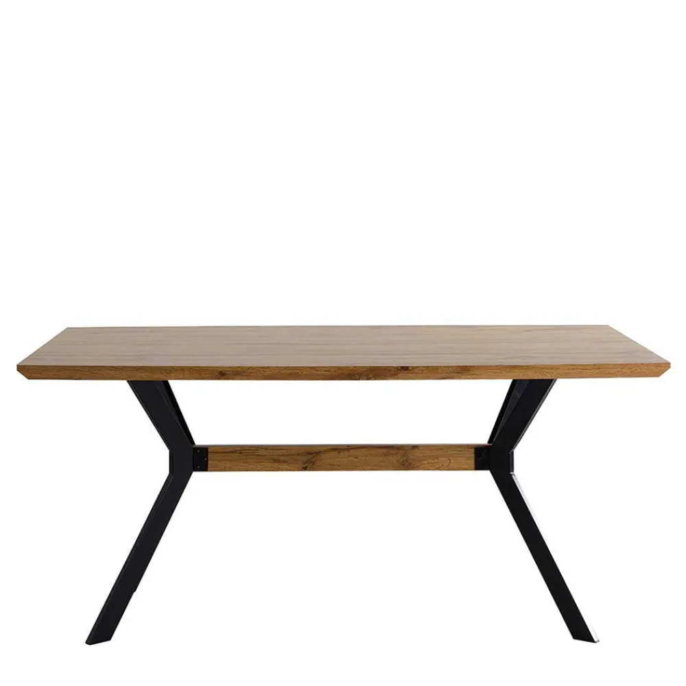 Stabilität bietet das Vierfußgestell aus pulverbeschichtetem Metall, das zusätzlich durch eine Verstrebung in Eichenoptik unterstützt wird. Dieses Designelement bringt nicht nur zusätzliche Standfestigkeit, sondern greift auch visuell die warme Holzoptik der Tischplatte auf – für ein rundum harmonisches Gesamtbild.