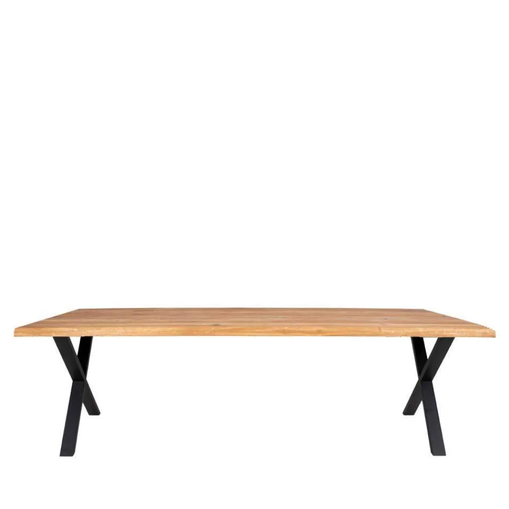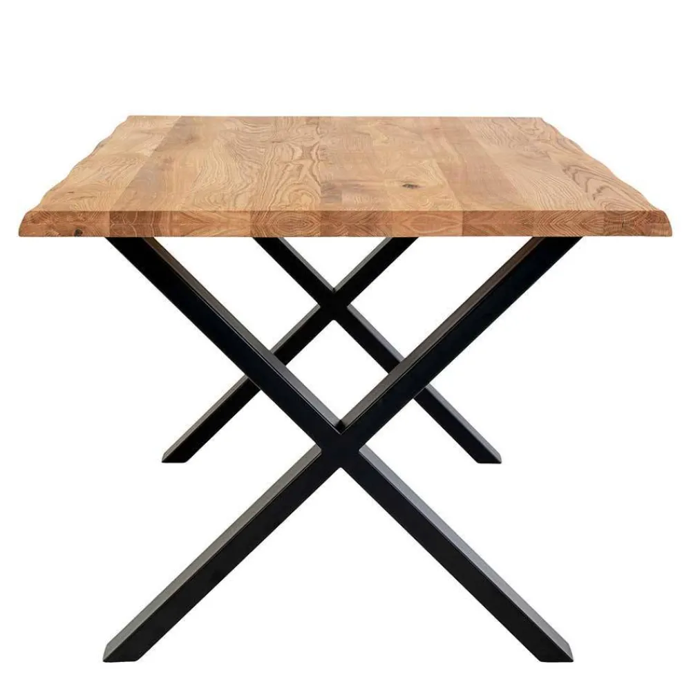 Die Tischplatte ist das Herzstück der Esszimmergruppe Anglesio: Aus massivem Eichenholz gefertigt, etwa 4 cm stark und längs geteilt. Die lebhafte Maserung und die einzigartig gewachsenen Baumkanten machen jeden Tisch zu einem Unikat. Da die Tiefe der Platte aus dem natürlichen Stamm geschnitten ist, variiert sie leicht, was den Tisch zu einem echten Blickfang macht. Jedes Exemplar ist einzigartig und bringt ein Stück Natur direkt in Ihr Zuhause. Das schwarze Stahlgestell in stabiler X-Form sorgt für maximale Standfestigkeit und verleiht dem Tisch einen markanten, modernen Akzent.