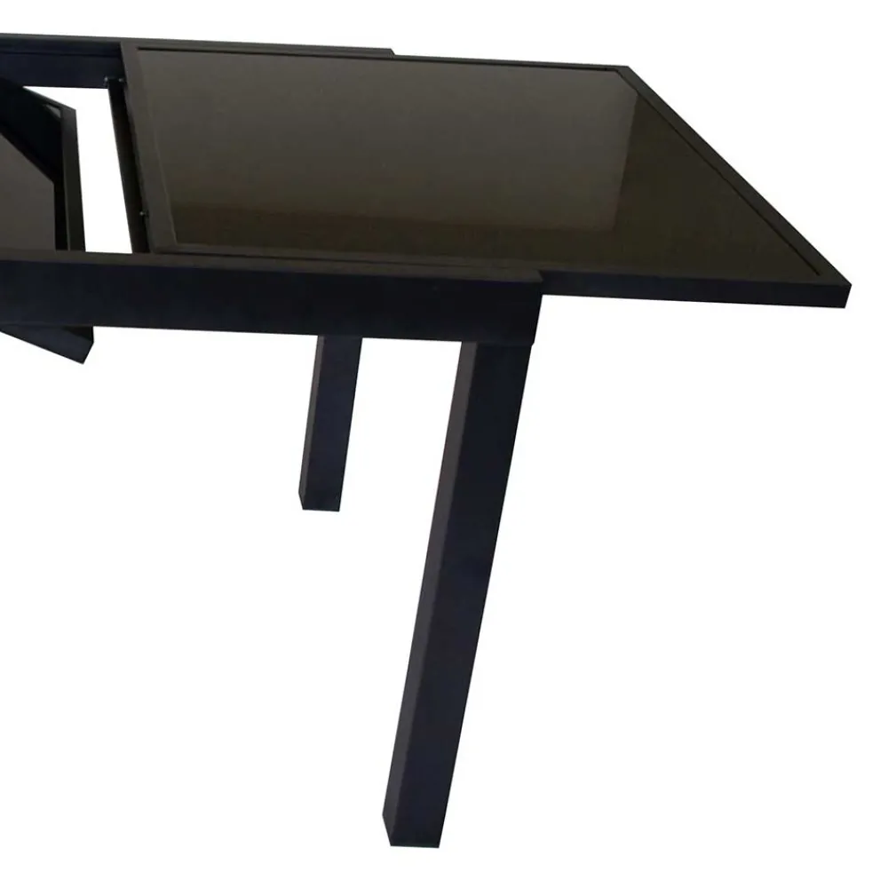 Das Design des Gartentisches „Chiano“ besticht durch klare, elegante Linien und eine harmonische Farbgebung. Der Tisch vereint Schwarz und Anthrazit in einer Weise, die sowohl modern als auch zeitlos wirkt. Diese Farben fügen sich mühelos in verschiedene Außenumgebungen ein und setzen geschmackvolle Akzente. Die schwarze Tischplatte aus Sicherheitsglas sorgt für eine klare, transparente Optik, die den Tisch besonders edel und stilvoll erscheinen lässt. Das Anthrazit des pulverbeschichteten Aluminiumgestells verleiht dem Tisch zusätzlich eine robuste Ausstrahlung, die perfekt in moderne Gärten, auf Balkone oder Terrassen passt.