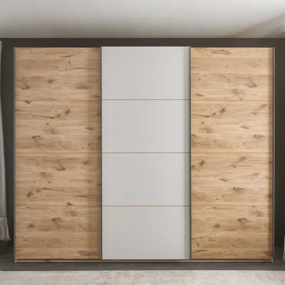 Unser Schwebetürenschrank „Simple“ besticht durch sein modernes Design und seine erstklassige Verarbeitung. Aus robuster Spanplatte gefertigt, bietet dieser Schrank nicht nur eine stabile Struktur, sondern auch zahlreiche Vorteile. Spanplatten zeichnen sich durch ihre hohe Widerstandsfähigkeit aus, sind langlebig und bieten eine gleichmäßige Oberfläche, die sich ideal für Folierungen eignet. Die pflegeleichte Oberfläche in heller Wildeiche und Grau ist nicht nur optisch ansprechend, sondern auch besonders leicht zu reinigen, was den täglichen Gebrauch erleichtert.