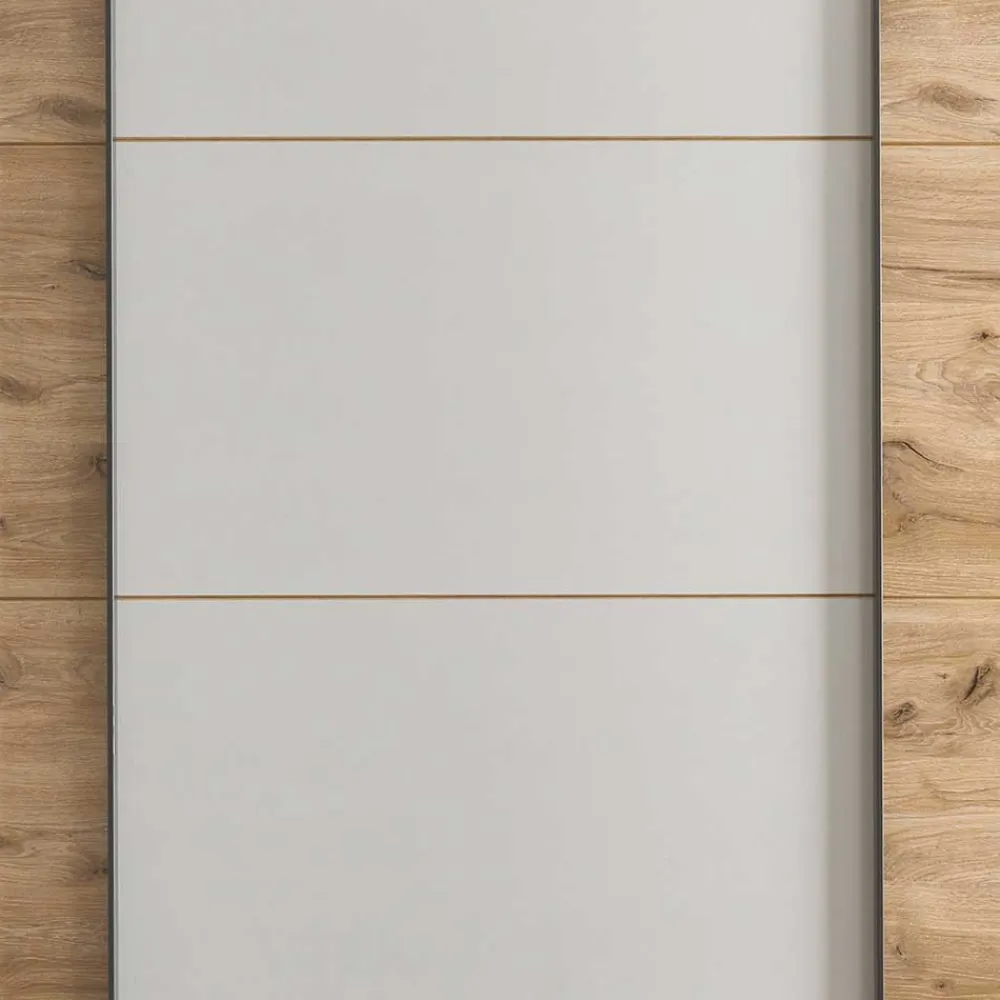 Die optisch geteilten Fronten des Schranks sind aufwändig gestaltet und setzen durch die in Grau abgesetzte mittlere Türfront stilvolle Akzente. Die schlanken Metallgriffe in Anthrazit unterstreichen den modernen Look und sorgen dafür, dass sich die Türen mühelos öffnen und schließen lassen. Hinter den Türen verbergen sich drei Facheinheiten: links befinden sich vier Einlegeböden, während sich mittig und rechts jeweils zwei Einlegeböden und eine stabile Kleiderstange aus Metall finden. Diese intelligente Aufteilung bietet ausreichend Platz für Kleidung, Accessoires und vieles mehr.