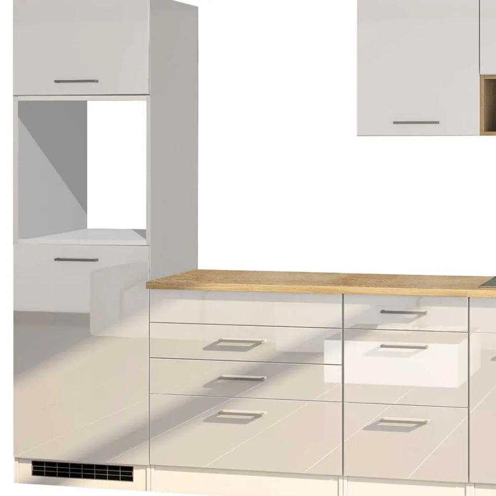 Die Fronten der Küchenzeile bestehen aus hochwertigem MDF (Mitteldichte Holzfaserplatte), das bekannt ist für seine Widerstandsfähigkeit und Umweltfreundlichkeit. MDF ist nicht nur robust, sondern auch besonders formstabil – perfekt für den täglichen Gebrauch in der Küche. Die Fronten sind in einem ansprechenden Weiß Hochglanz foliert. Dieses Verfahren sorgt nicht nur für eine glänzende Optik, sondern macht die Oberfläche besonders pflegeleicht und resistent gegen Feuchtigkeit und Kratzer.