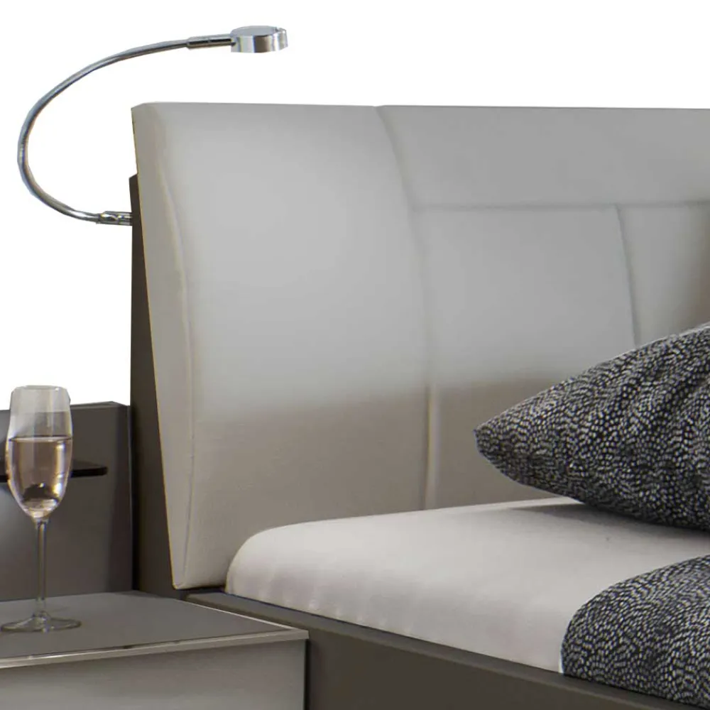 Die Nachtkommoden werden ergänzt durch elegante Wandpaneele mit Rauchglasböden und LED Touch Beleuchtung, während das Doppelbett mit energieeffizienten LED-Flexleuchten am Kopfteil ausgestattet ist, ideal für Lesenächte oder entspannte Momente vor dem Schlafengehen.