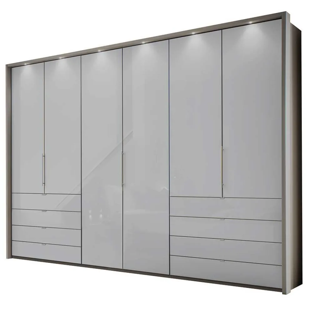 Nicht nur im Design, auch in der Funktionalität setzt das „Ocavado“ Maßstäbe: Der Falttüren-Kleiderschrank ist ausgestattet mit einem Passepartoutrahmen und integrierten LED-Leuchten, die für eine angenehme Atmosphäre sorgen. Die Schubladen mit Soft Close Funktion und Selbsteinzug garantieren einen sanften und leisen Betrieb. Die langen Metallgriffleisten erleichtern nicht nur die Handhabung, sondern sind auch ein optischer Blickfang.